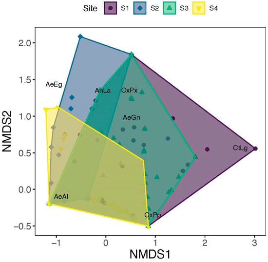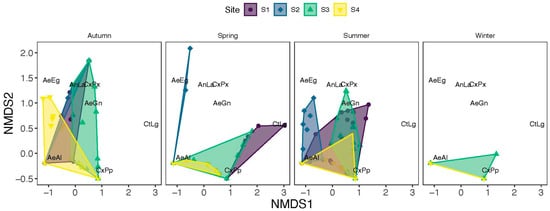 NMDS analysis showed a separation of samples due to sites (Figure 5; k = 2, stress = 0.08). PERMANOVA confirmed a significant impact of sites (R2 = 0.17, F3,352 = 27.3, p = 0.001) and year (R2 = 0.01, F1,352 = 3.60, p = 0.004) on the diversity of species. There was a marked overlap in the diversity of mosquitoes between site 1 and site 3 as well as site 4 and site 3, while Site 2 showed a weaker overlap with the other sites (Figure 5). Our NMDS analysis also showed a seasonal separation of samples (Figure 6), as revealed by a significant effect of season (R2 = 0.05, F3,352 = 8.20, p = 0.001). The significant interaction between sites and season shows that the overlap in mosquito diversity between sites differed between seasons (R2 = 0.06, F7,352 = 4.53, p = 0.001) (Figure 6).