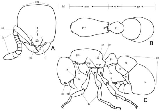 Line drawing of Proceratium (as: antennal socket; de: declivity of propodeum; ey: eyes; fl: frontal lobe; fu: funiculi; ga: gaster; hd: head; mes: mesosoma; le: leg; mc: median portion of clypeal; mn: mandible; mpl: mesopleuron; mtp: metapleuron; om: occipital margin; ppd: propodeum; pr: propleuron; prs: promesonotum; pt: petiole; w: waist; s: sting; sb: subpetiolar process; sc: scapes; sp: propodeal spiracle; st: sternite; tr: tergite). (A) Head in full-face view; (B) body in dorsal view; (C) body in lateral view.