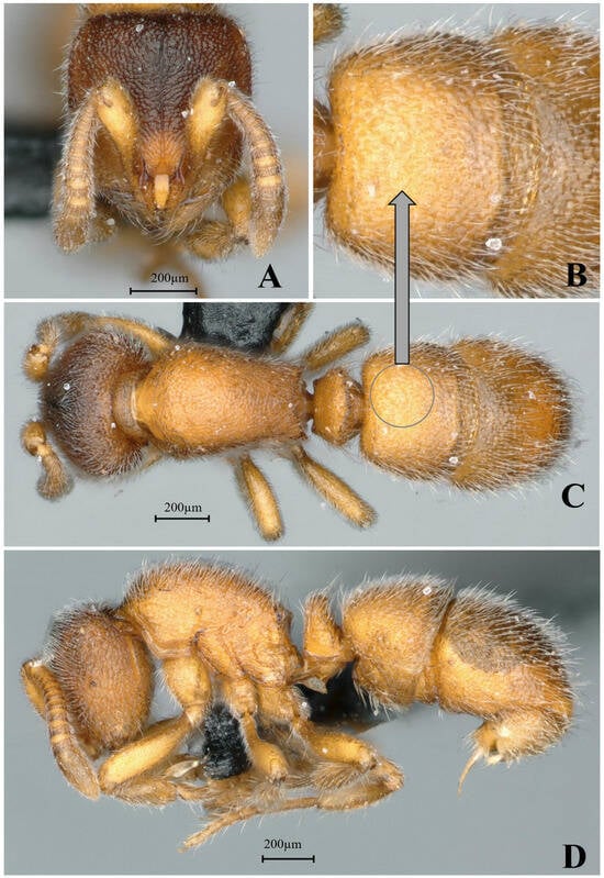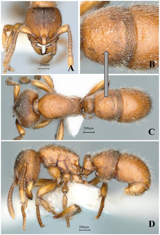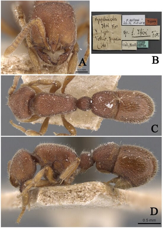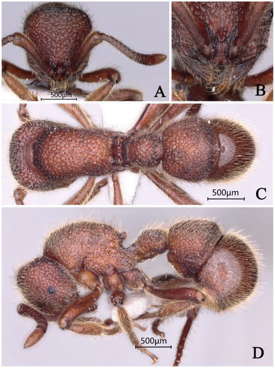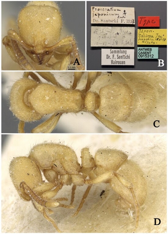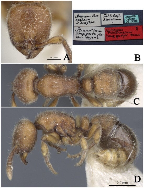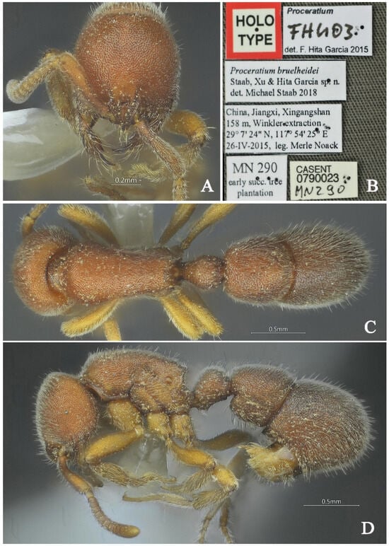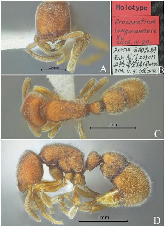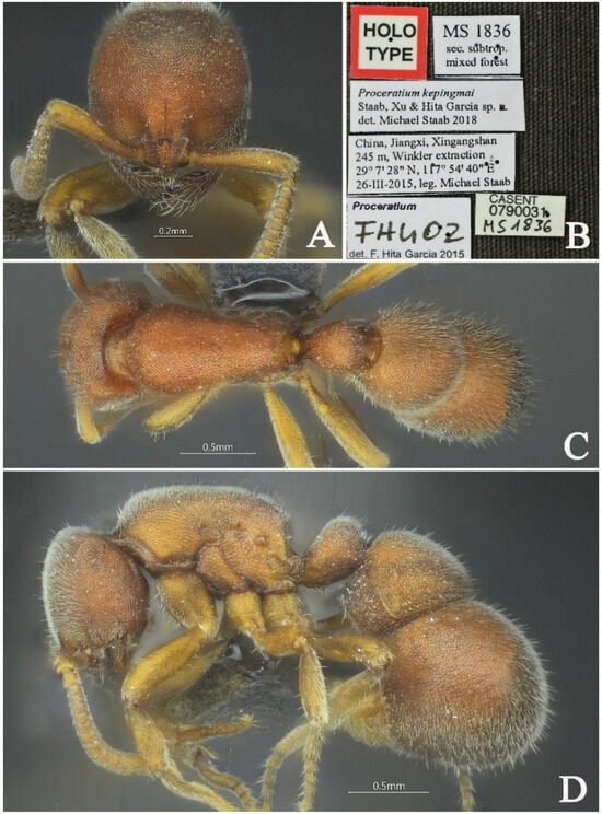 Proceratium shohei, holotype worker (photographed by Zhenghui Xu). (A) Head in full-face view; (B) label of holotype; (C) body in dorsal view; (D) body in lateral view.