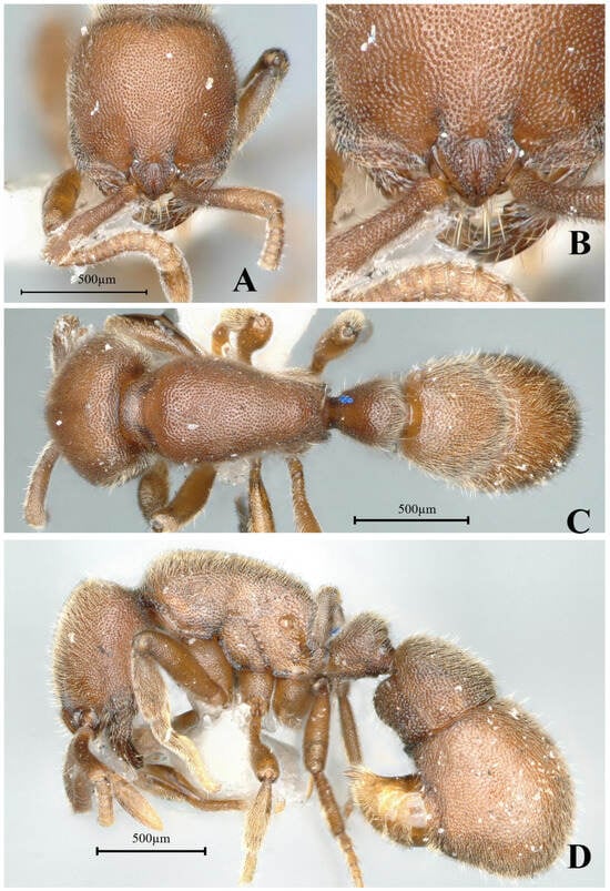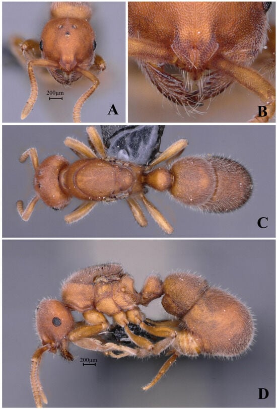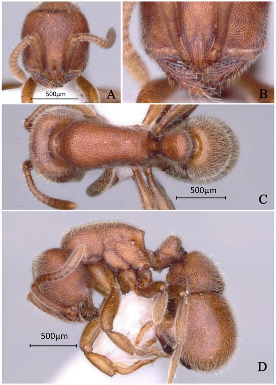 Worker measurement. (n = 2) TL 3.23–3.24, HL 0.72–0.74, HW 0.72–0.73, CI 97–100, SL 0.52–0.54, SI 72–75, ML 0.38–0.39, PW 0.50–0.51, MSL 0.93–0.94, PL 0.28–0.32, PH 0.33–0.36, DPW 0.30–0.31, LPI 113–118, DPI 97–107.