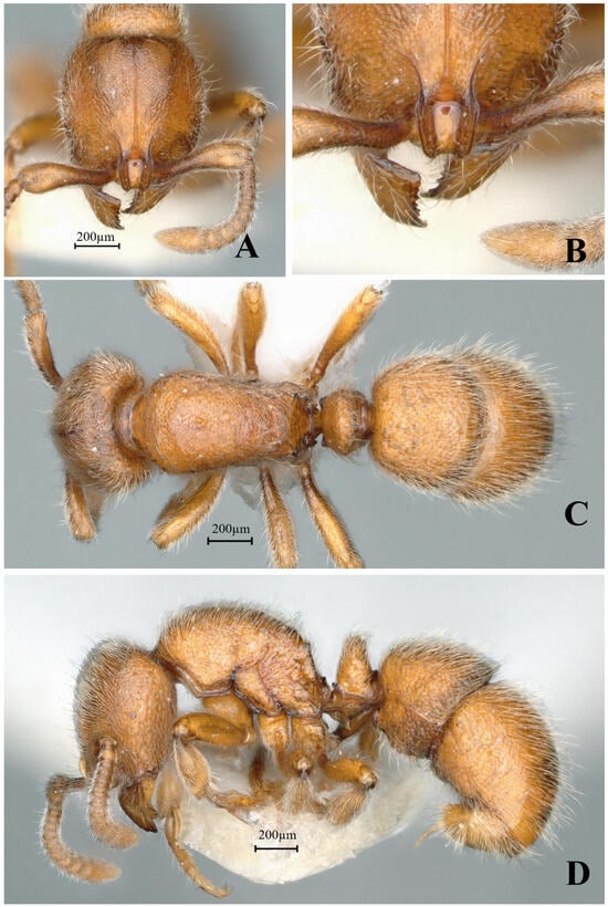 Proceratium recticephalum sp. nov., holotype worker (photographed by Zhilin Chen). (A) Head in full-face view; (B) mandible in full-face view; (C) body in dorsal view; (D) body in lateral view (urn:lsid:zoobank.org:act:F4BA392D-35BE-4D36-856D-316B91FFE6B7).