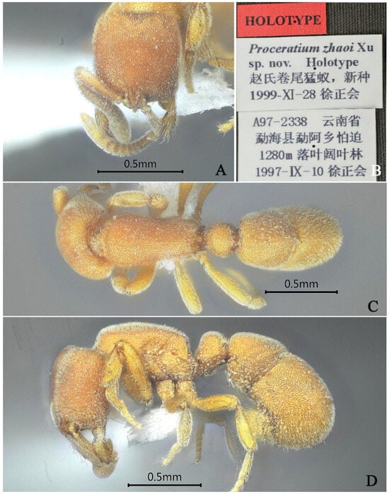 Proceratium zhaoi, holotype worker. (A) Head in full-face view; (B) label of holotype; (C) body in dorsal view; (D) body in lateral view.