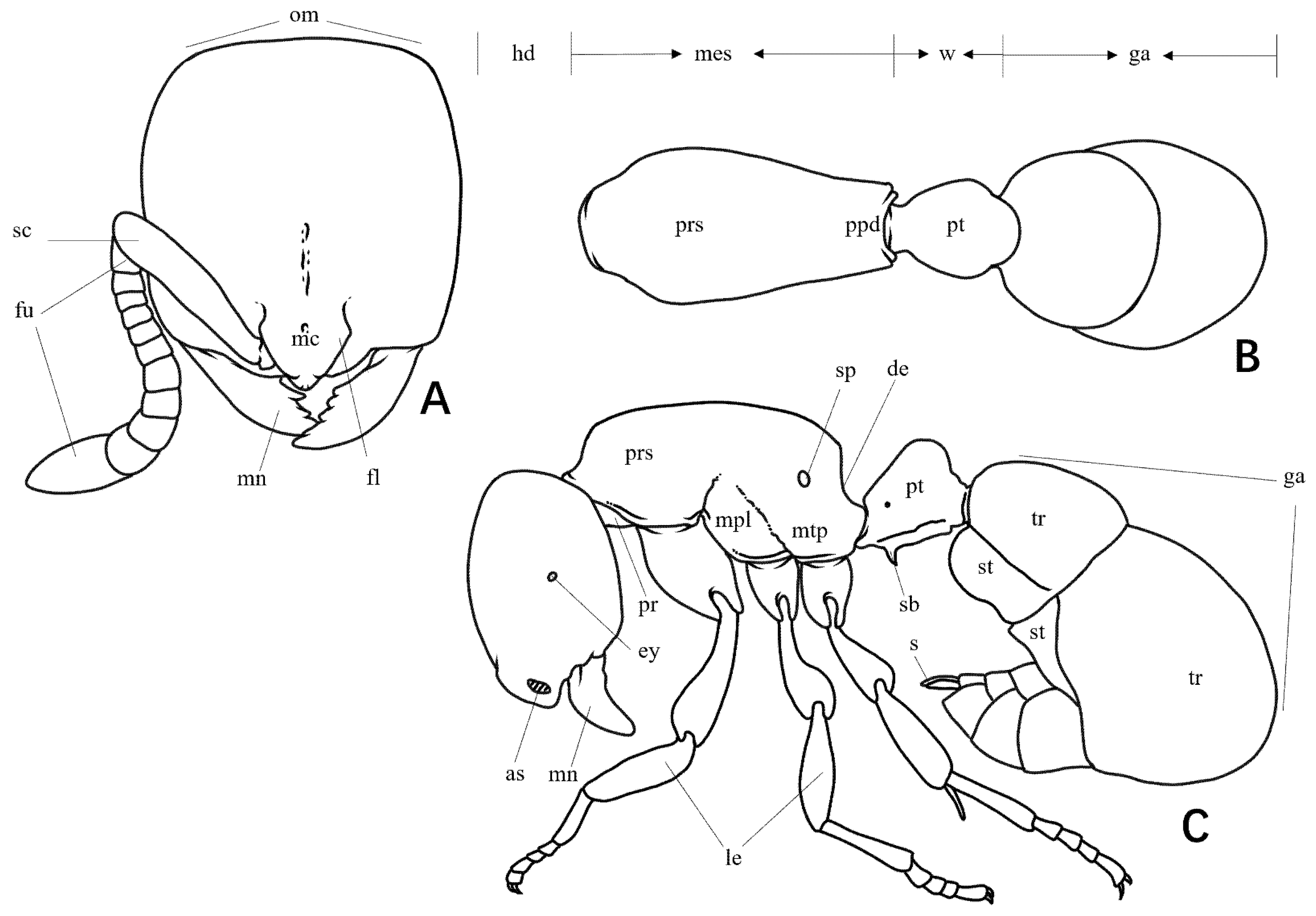 Worker measurement. (n = 2) TL 3.93–3.97, HL 0.91–0.93, HW 0.87–0.88, CI 94–96, SL 0.63–0.68, SI 72–78, ML 0.40–0.42, PW 0.69–0.71, MSL 1.16–1.25, PL 0.42–0.44, PH 0.32–0.33, DPW 0.41–0.42, LPI 73–79, DPI 96–98.