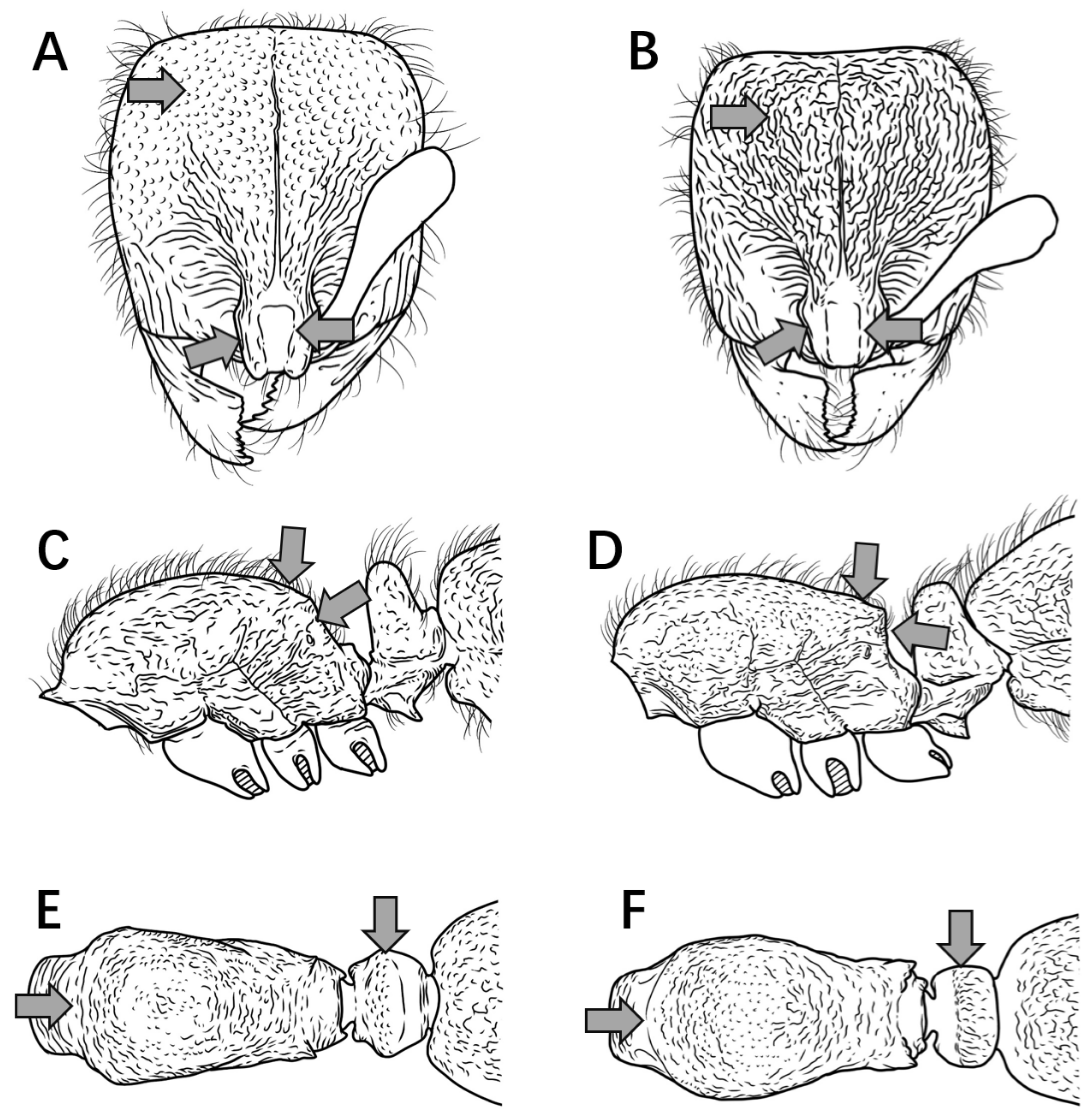 Worker measurement. (n = 5) TL 3.23–3.24, HL 0.68–0.69, HW 0.62–0.63, CI 91–92, SL 0.42–0.44, SI 68–70, ML 0.31–0.33, PW 0.44–0.46, MSL 0.87–0.89, PL 0.31–0.32, PH 0.25–0.26, DPW 0.27–0.28, LPI 80–82, DPI 87–88.