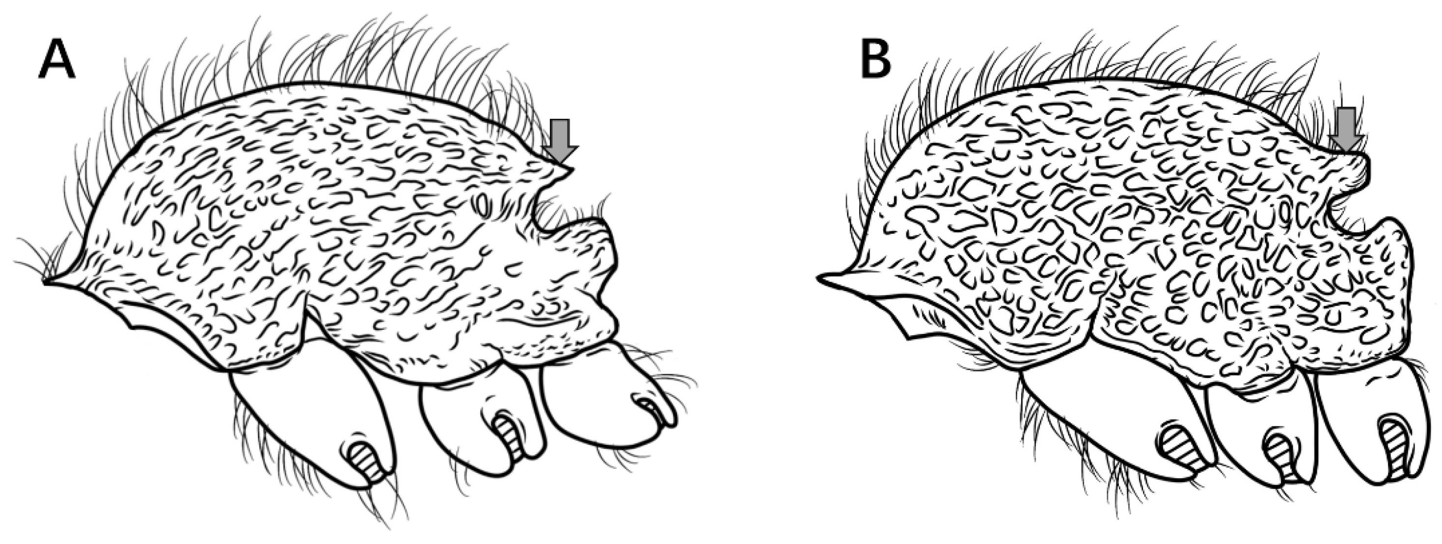 Figure 9B), contrasting sharply with the acutely triangular spines of closely related congeners (e.g.,