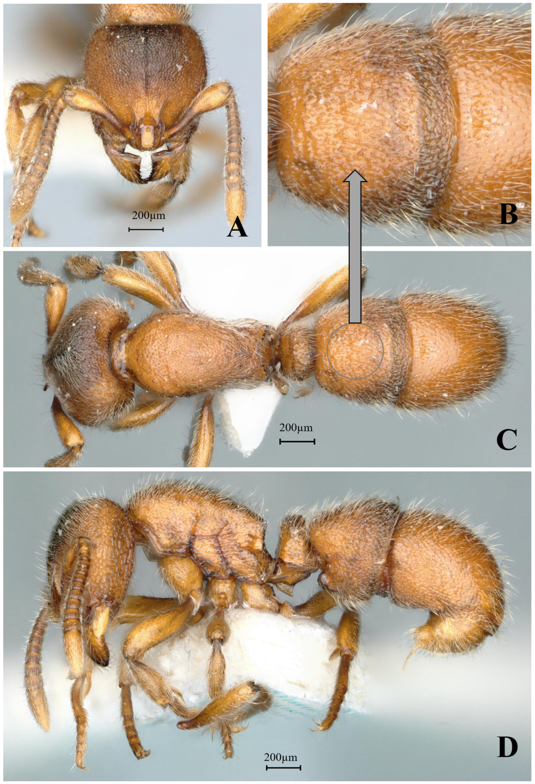 Description (workers). Head. In full-face view, head slightly trapezoidal, lateral margins convex, posterior margin straight; posterior corners rounded. Mandibles triangular, masticatory margin with seven teeth: apical two teeth relatively large, teeth 3–5 medium-sized, teeth 6–7 basally fused and comparatively smaller. Frontal lobes slightly elevated, anterolateral margins straight; interfrontal space with a shining area narrowing anteriorly and widening posteriorly. Scape extending posteriorly to 3/5 the distance from antennal fossa to occipital margin. Eyes reduced, positioned at midlength of lateral cephalic margins. Mesosoma. In lateral view, mesosomal dorsum convex; propodeal declivity steep, meeting dorsum at distinct angulation forming a tooth-like projection. In dorsal view, anterior pronotal margin convex; lateral margins gradually converging posteriorly toward propodeum then slightly diverging; posterior margin emarginate; posterolateral corners acutely dentate. Metasoma. In lateral view, petiolar node anteroposteriorly compressed, trapezoidal with both anterior and posterior faces steep; node height approximately 1.2× width. Abdominal segment III (first gastral) tergite overlapping sternite; anteroventral sternal corner forming rounded lobe-like projection. In dorsal view, petiolar node width approximately 4 × length; anterior margin of abdominal segment III nearly straight. Sculpture. Mandibular dorsum with longitudinal striae on outer half and sparse punctures on inner half. Triangular area between frontal lobes smooth and shining; remainder of head densely punctate-rugose, with coarsest rugosity along cephalic midline. Mesosomal sides and dorsum with relatively sparse, shallow punctures, somewhat shining. Petiole and first gastral tergite with rugae formed by confluent tubercles. Second gastral tergite smooth and shining. Pilosity and pubescence. Body densely covered with decumbent pubescence and abundant suberect hairs throughout. Coloration. Body yellowish-brown, head slightly darker in coloration.