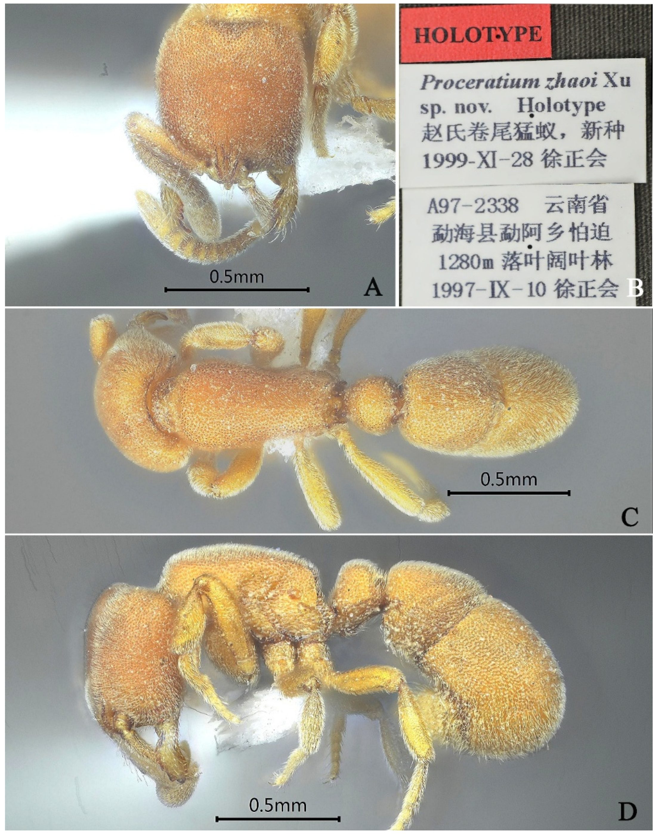 Proceratium, providing high-resolution color images and scanning electron micrographs, as well as clarifying key diagnostic characters among species. However, when identifying the specimens from Zhejiang and Hunan as