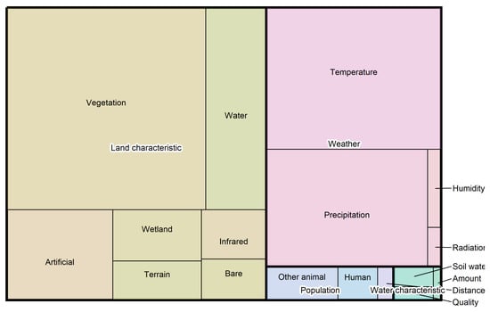 The second-largest category is ‘Weather’, which primarily comprises ‘Temperature’ and ‘Precipitation’ variables, with temperature being more prevalent. Together with ‘Vegetation’, the subcategories ‘Temperature’ and ‘Precipitation’ constitute the dominant group of explanatory variables. These variables capture ecologically relevant factors identified across multiple studies and settings, suggesting they are likely to influence Aedes vexans distribution in future models and across different regions or conditions. For example, temperature is a known determinant of larval development and vegetation affects site selection for oviposition by female mosquitoes [21,22,23,25].
