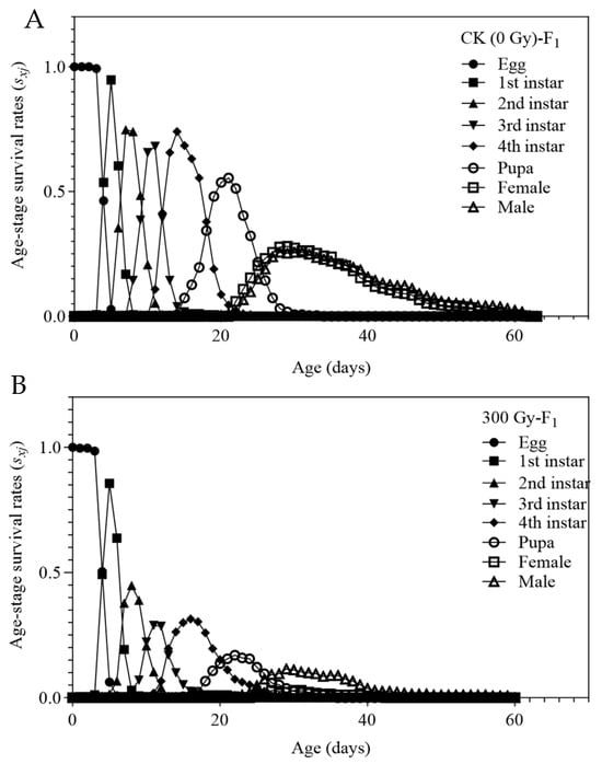 Age-stage -specific survival rate (sxj) of Tuta absoluta F1 generation. (A) Survival rate of offspring of male parent treated with no irradiation. (B) Survival rate of offspring of male parent treated with 300 Gy gamma irradiation doses.