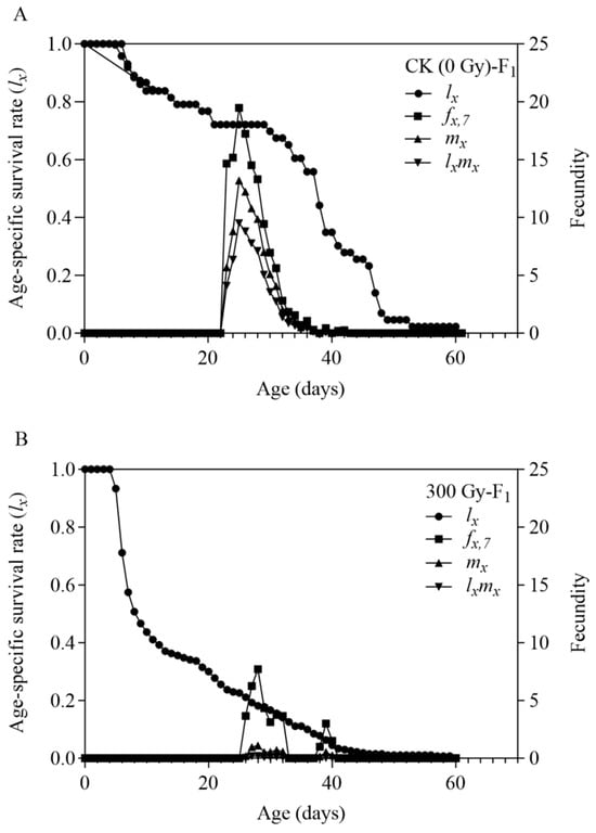 Age-specific survival rate (lx), age-specific fecundity (fx,7), age-specific fecundity (mx) and age-specific net fecundity (lxmx) of the F1 population of Tuta absoluta. (A) Offspring of male parent treated with no irradiation. (B) Offspring of male parent treated with 300 Gy gamma irradiation doses.