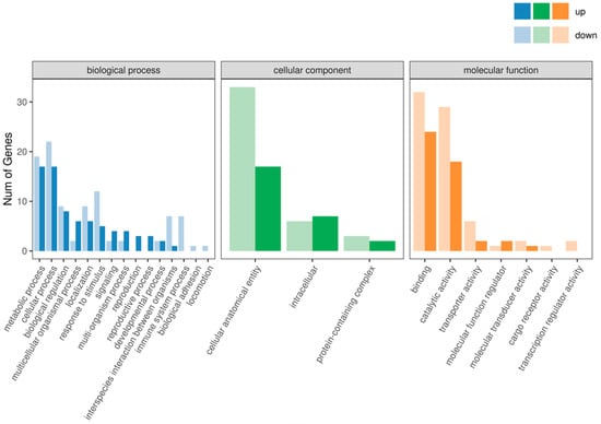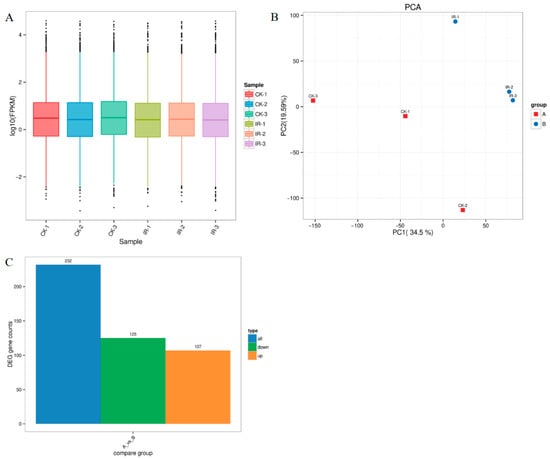 To further explore the molecular mechanism of inherited sterility in T. absoluta and identify its target genes, the transcriptome sequencing was used. Sequencing data are shown in Table 5. After filtering and quality control of the raw data, the CK group produced 19,546,077–26,314,076 clean reads, while the IR group generated 22,573,216–25,163,786 clean reads. Eukaryotic reference-based transcriptome (RNA-seq) analysis of the six samples yielded a total of 41.19 Gb of clean data, with each sample contributing at least 5.82 Gb. The percentage of Q30 bases was 97.70% or higher, and the GC content of the sample sequences ranged from 42.95% to 43.89%. The efficiency of aligning the reads from each sample to the reference genome was between 76.94% and 81.71%. These results demonstrate the high-quality metrics of the transcriptome sequencing data, confirming their suitability for subsequent bioinformatics analyses.