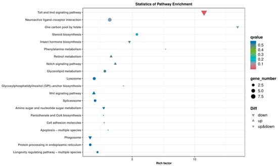 GO analysis showed that the differentially expressed genes were mainly involved in metabolic processes and binding functions, with notable enrichment of “One carbon pool by folate” and “Pantothenate and CoA biosynthesis” in KEGG pathways. Folate metabolism is a key pathway for DNA synthesis and methylation, and its disruption can directly lead to abnormal embryonic development, such as a lower egg hatching rate. Moreover, folate is crucial for germ cell proliferation [41]. Coenzyme A participates in energy metabolism and lipid synthesis [42], which may affect energy storage during the pupal stage and influence adult fecundity.
