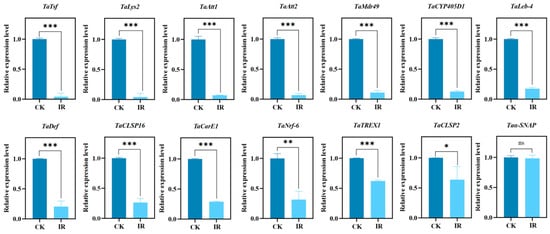 Based on the results above, 14 target genes potentially related to male fertility were identified. TaTREX1 is involved in replication, recombination, and repair processes. TaCarE1 functions in carbohydrate transport and metabolism. TaCYP405D1 and TaMdr49 are connected to the biosynthesis, transport, and breakdown of secondary metabolites, as well as lipid transport and metabolism. TaNrf-6 belongs to the acyltransferase family and participates in lipid metabolism. Trypsins TaCLSP16 and TaCLSP2, along with TaAtt1, TaAtt2, and TaLys2, are linked to post-translational modification, protein turnover, and chaperoning. Taα-SNAP is involved in intracellular transport, secretion, and vesicle trafficking. Transferrin TaTsf relates to energy production and conversion. TaDef plays a role in signal transduction. TaLeb-4 is an antimicrobial peptide key to host defence. RT-qPCR validated the expression of these genes. The findings (Figure 6) indicated that 13 genes were significantly downregulated in the irradiated progeny. These genes will be further studied to explore their association with decreased male fertility in T. absoluta.