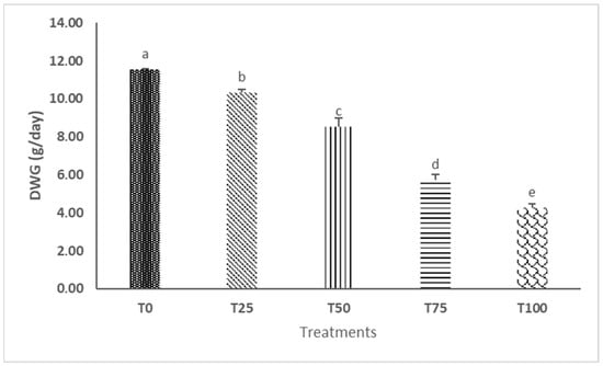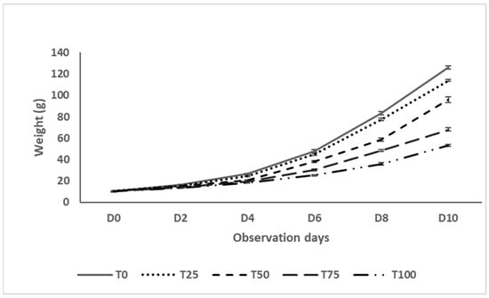 The growth curves (Figure 1) of black soldier fly larvae (BSFL) production varied based on the rearing substrates used. Adding more water lettuce leaf (WLL) resulted in a lower weight for the black soldier fly larvae. This trend was also evident in the daily weight gain (DWG). A significant difference was observed in the DWG between the different treatments (p < 0.05). Larvae reared on the substrate without WLL (T0) exhibited the highest weight gain, followed by T25, T50, and T75, while those in the T100 showed the lowest DWG. Notably, the DWG declined significantly when the WLL incorporation exceeded 50% (Figure 2).
