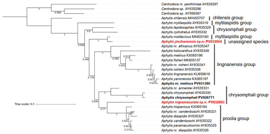In the Bayesian analysis (Figure 16), three Centrodora species (Aphelinidae) are the outgroup and the Aphytis species cluster on a large branch, in which the species of lingnanensis and proclia groups each cluster on a branch (1.00 posterior probability). The species of the chrysomphali group irregularly form 2 distinct branches. This group is probably polyphyletic in origin. Aphytis lepidosaphes and Aphytis cylindratus are distantly related to the other three species of the chrysomphali group. In morphology, Aphytis lepidosaphes and Aphytis cylindratus belong to the chrysomphali group, but their characteristics are closely related to the other groups. Aphytis nigromaculata, sp.n. is placed in a branch (0.77 posterior probability) with the species of proclia group, but it indeed belongs to the chrysomphali group. While Aphytis jinshanensis, sp.n. is independent from the branch of the chrysomphali, lingnanensis and proclia groups, and clusters on the branch with Aphytis moldavicus.