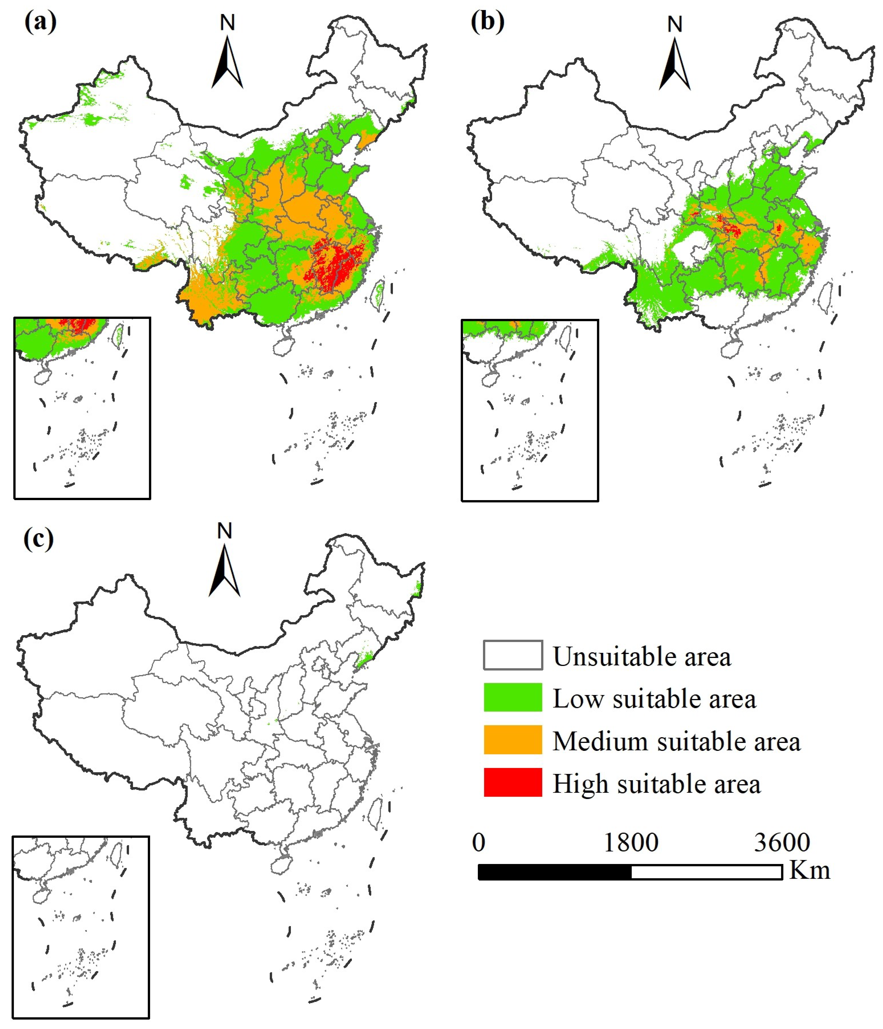 Highly Suitable Area (×104 ha) | Moderately Suitable Area (×104 ha) | Low Suitable Area (×104 ha) | Total Suitable Area (×104 ha) | |