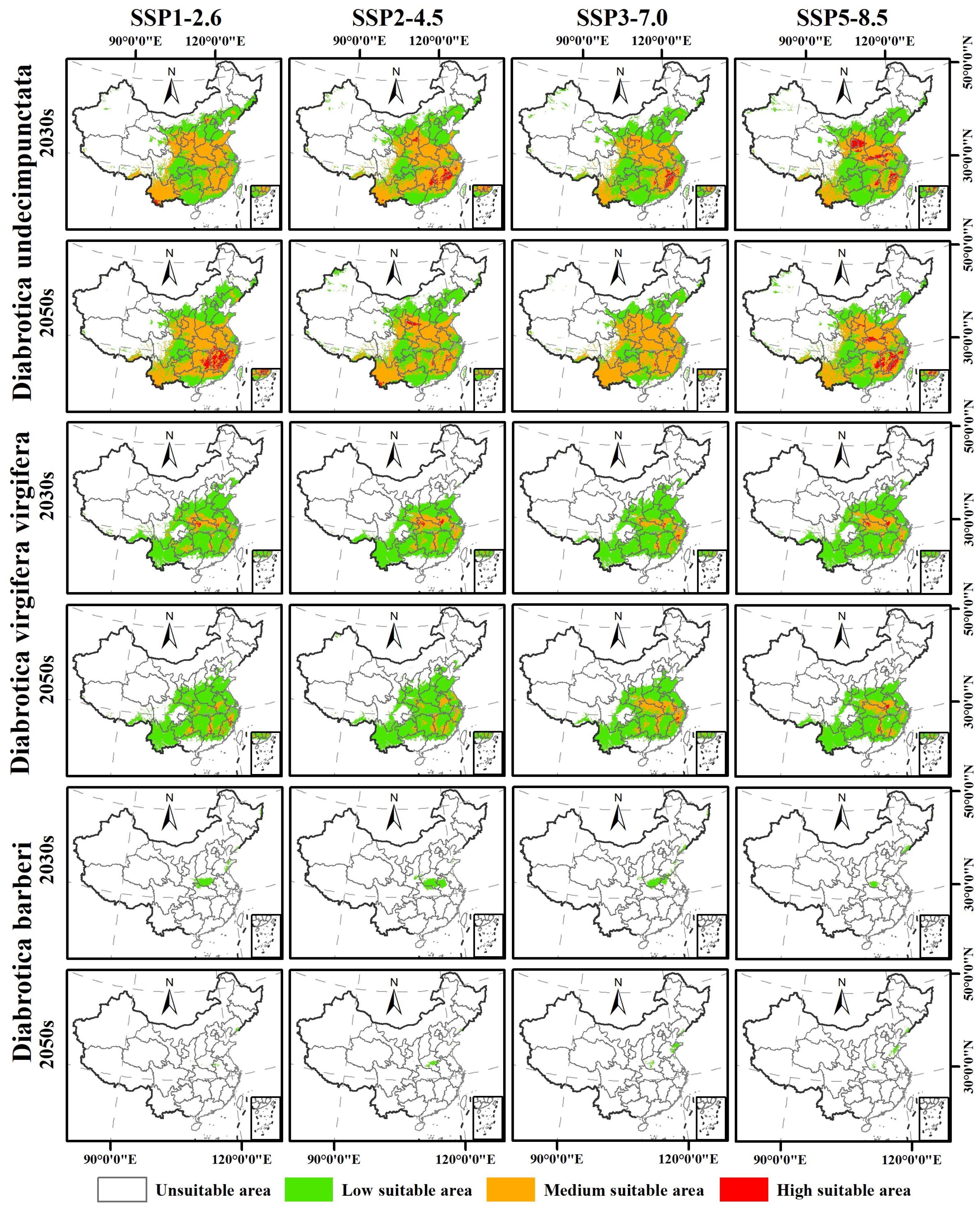 Jin Y, Shao F, Zheng S, Wang Y, Hu G, Chen F. Potential Geographic Distribution and Suitable Area of Three Species of Diabrotica (Coleoptera: Chrysomelidae) Beetles in Corn-Planting Regions of China. Insects. 2025; 16(10):1072. https://doi.org/10.3390/insects16101072
