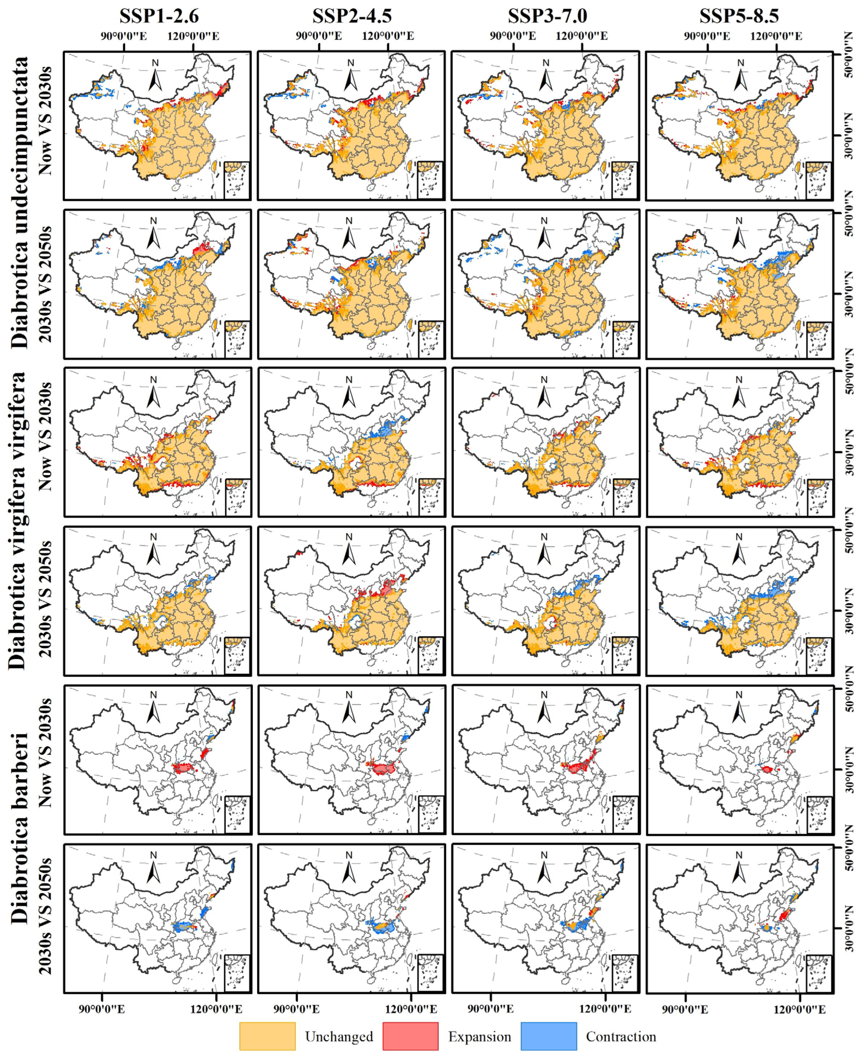3.5. Changes in Potential Geographic Distribution Range of the Three Diabrotica Species in China in the Future