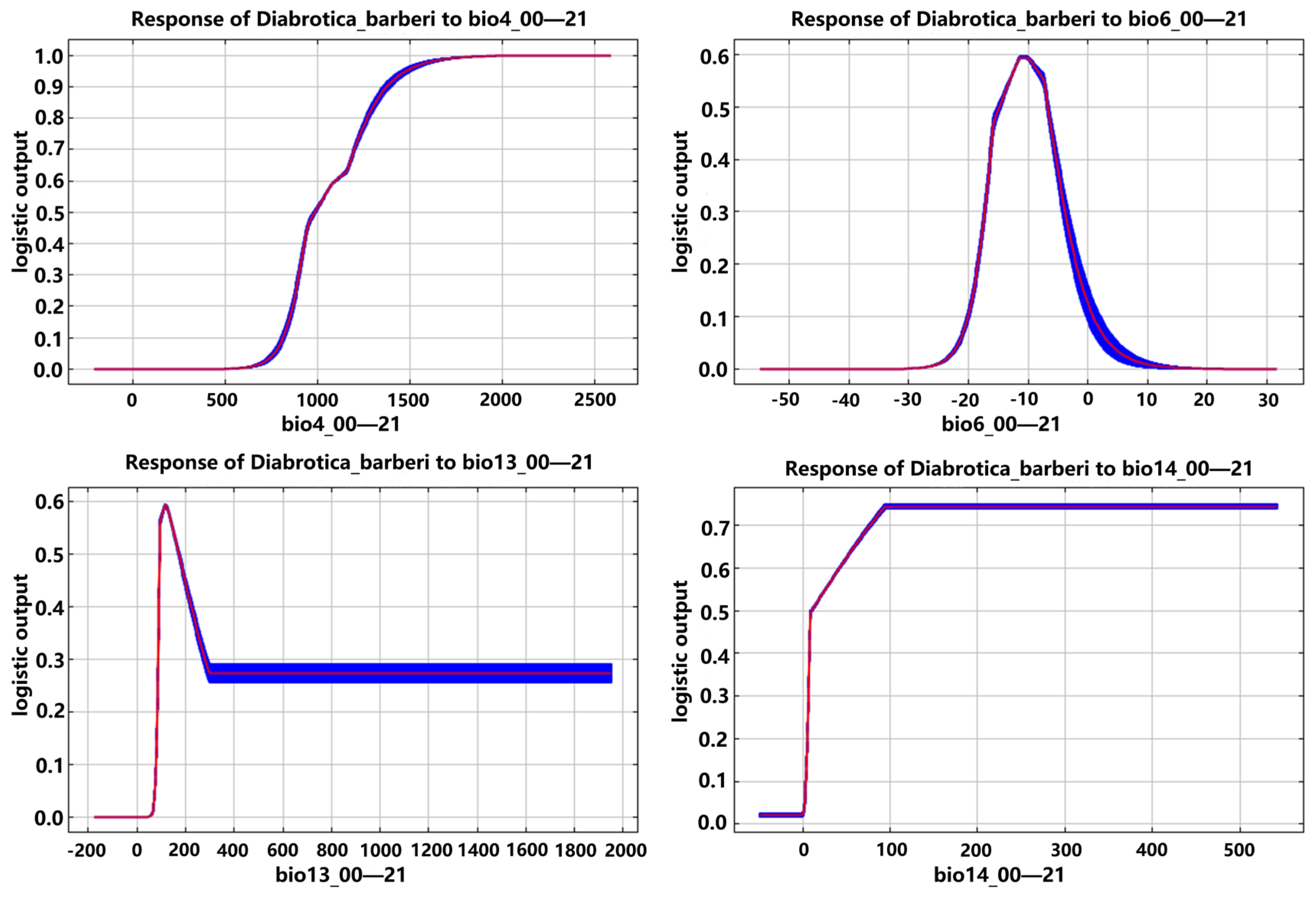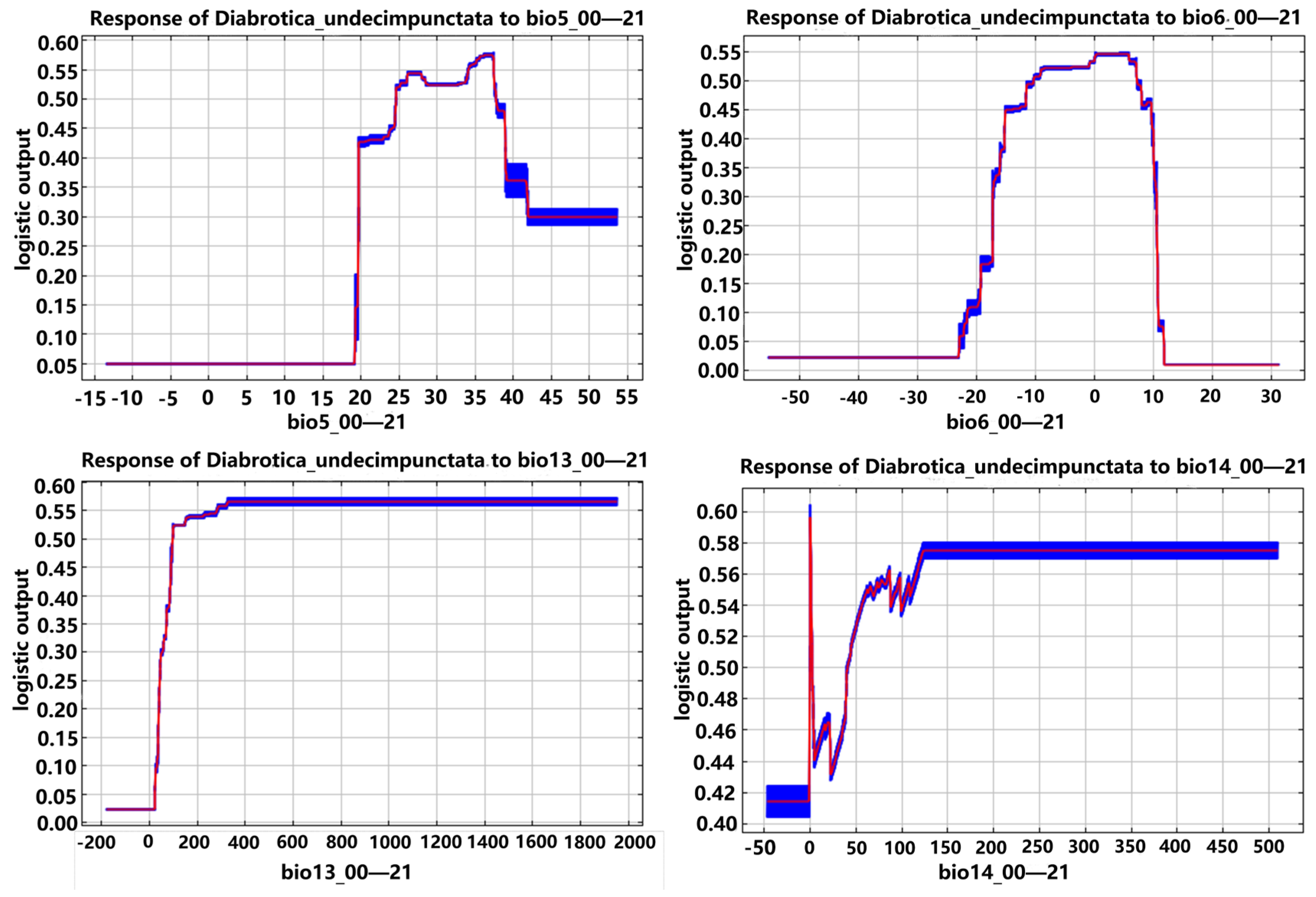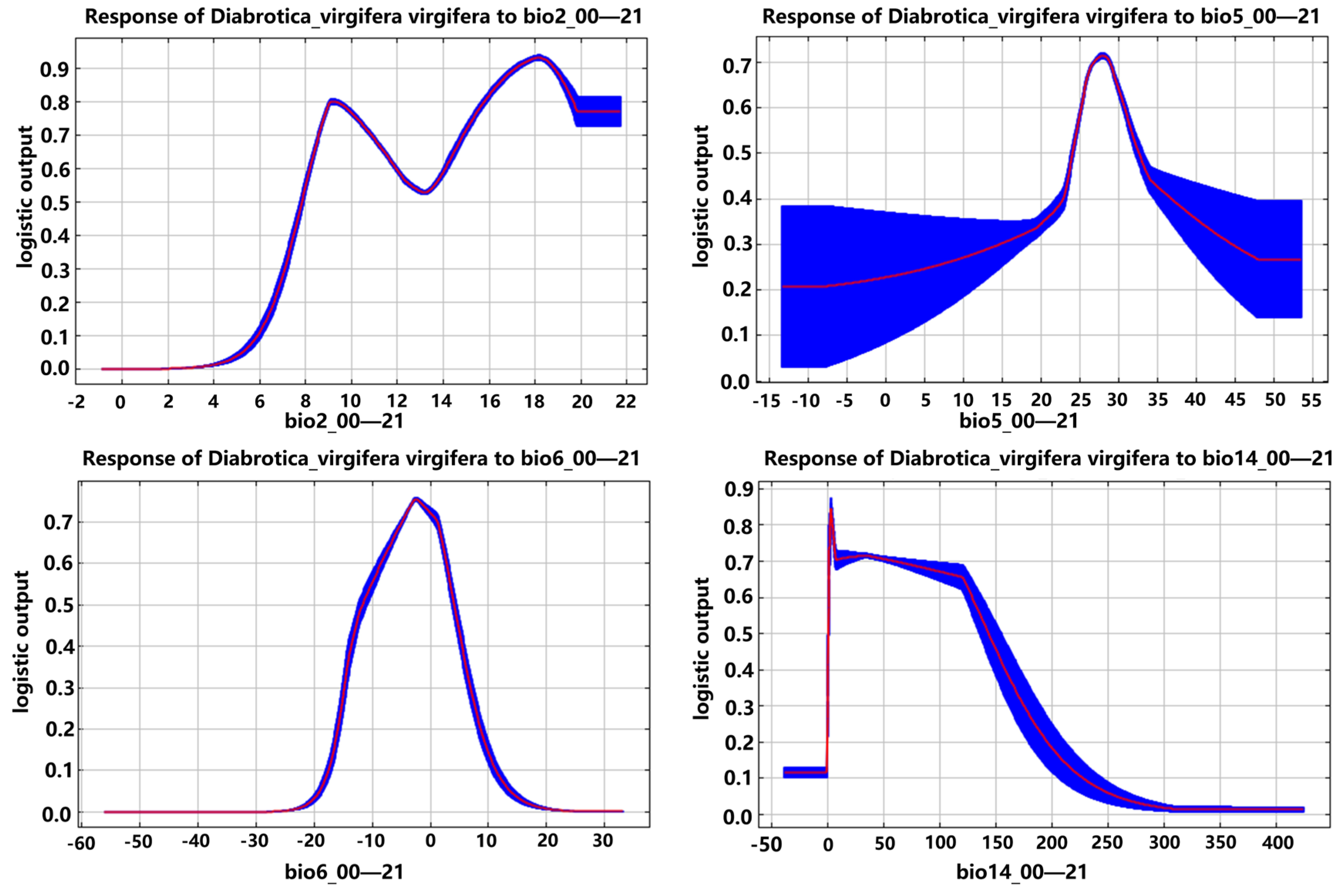 3.6. Analysis of the Response of Dominant Environmental Variables to the Potential Geographic Distribution Probabilities of the Diabrotica Beetles in the MaxEnt Model
