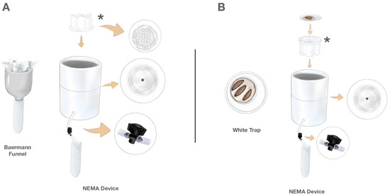 The NEMA Device was constructed with three nested PVC components, combining elements of the Baermann funnel and White trap method (Figure 1). The initial PVC component (depicted by the asterisks in Figure 1) is constructed from a round white PVC 7.6 cm diameter snap-in drain (Oatey, Cleveland, OH, USA) with ridges cut into the base to allow free fluid flow. Because of the grid bottom, this component serves a dual function, both as a retainer for soil samples when the NEMA Device is used for soil extraction (Figure 1A) and, when flipped, as a platform for emergence when the NEMA Device is used for rearing (Figure 1B).