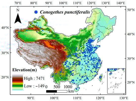 The occurrence locations of C. punctiferalis were sourced from the published literature and online databases, including Web of Science (accessed on 26 June 2025, at https://www.webofscience.com/wos/), EPPO (accessed on 27 June 2025, at https://gd.eppo.int), CABI (accessed on 27 June 2025, at https://plantwiseplusknowledgebank.org/), CNKI (accessed on 22 June 2025, at https://www.cnki.net/), and GBIF (accessed on 27 June 2025, at https://www.gbif.org/). Data points exhibiting duplicate latitude/longitude pairs or unidentifiable coordinates were removed. For distribution points lacking specific geographic coordinates, the corresponding latitude and longitude information was obtained using Google Earth (accessed on 28 June 2025, https://earth.google.com/web/). To prevent sampling bias and record redundancy from impacting the accuracy of model predictions, species distribution records were processed via ENMTools 1.4, with the aim of retaining only one distribution point within each grid at a spatial resolution of 2.5 arc-min (approximately 4.5 km2). The final dataset included 466 distribution points, which were used for model training and validation (Figure 1).