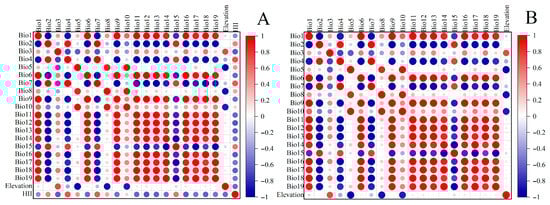 In addition, we assessed variable importance using the Jackknife method and quantified pairwise collinearity among environmental predictors through Pearson correlation analysis (SPSS software 24.0). This identified statistically significant correlations across the 19 bioclimatic variables, elevation, and HII. When the correlation coefficient of 2 variables was |r| > 0.8, we only retained the variables with a higher percentage contribution (Supplementary Table S1) [39]. The final predictor selection prioritized variables demonstrating both a high model contribution (Jackknife) and low multicollinearity (|r|≤ 0.8), ensuring ecological interpretability in distribution modeling [40]. Ultimately, Model 1 was built using 7 environmental variables: the mean diurnal range (bio2), isothermality (bio3), minimum temperature of the coldest month (bio6), mean temperature of the wettest quarter (bio8), precipitation in the driest month (bio14), precipitation seasonality (bio15), and elevation (Figure 2B). Model 2 was built using 7 environmental variables: the mean diurnal range (bio2), isothermality (bio3), minimum temperature of the coldest month (bio6), precipitation in the driest month (bio14), precipitation seasonality (bio15), elevation, and HII (Figure 2A).