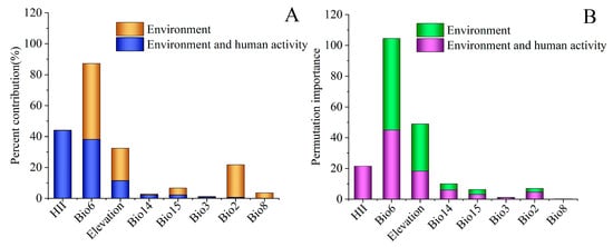 The contribution rate (A) and importance rate (B) of environmental variables in the MaxEnt model.