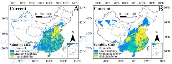 Spatial distribution of suitable habitats for C. punctiferalis with (A) and without (B) human activity disturbances under current climate scenarios.