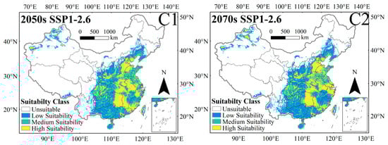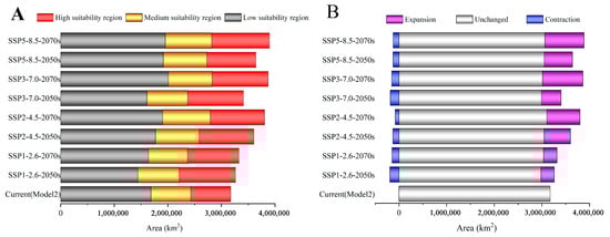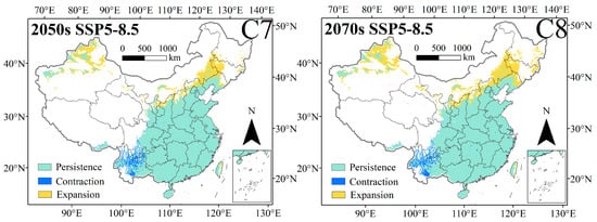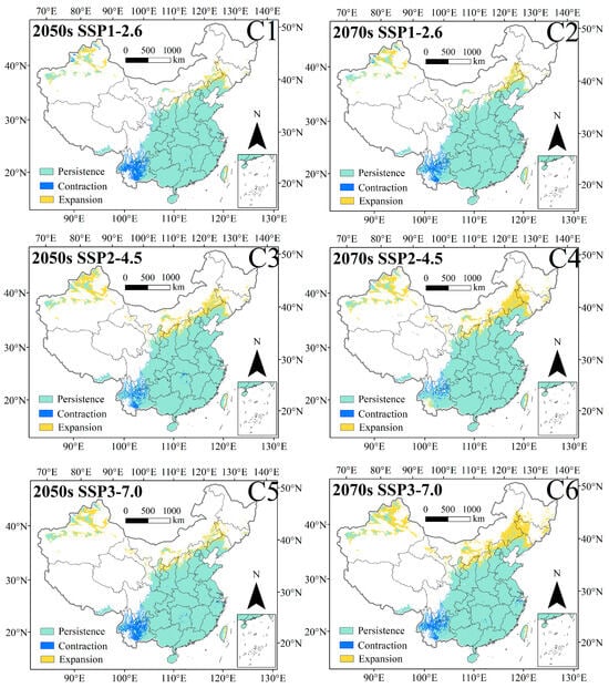 Under the SSP1-2.6, SSP2-4.6, SSP3-7.0, and SSP5-8.5 scenarios in the 2050s, the expansion areas for suitable habitat are 278,834 km2, 552,901 km2, 410,956 km2, and 592,085 km2, accounting for approximately 8.78%, 17.42%, 12.95%, and 18.65% of the current total suitable habitat area, respectively. Under different scenarios in the 2050s, the contraction areas for suitable habitat are 193,198 km2, 126,993 km2, 181,632 km2, and 124,532 km2, accounting for approximately 6.09%, 4.00%, 5.72%, and 3.92% of the current total suitable habitat area, respectively (Table 2, Figure 7(C1,C3,C5 and C7)). Under different scenarios in 2070s, the expansion areas of the suitable habitat are 282,221 km2, 695,362 km2, 848,061 km2, and 824,306 km2, respectively, accounting for approximately 8.89%, 21.91%, 26.72%, and 25.97% of the current total suitable habitat area, respectively. Under different scenarios in the 2070s, the contraction areas for suitable habitat are 148,595 km2, 80,491 km2, 153,237 km2, and 122,095 km2, accounting for approximately 4.68%, 2.54%, 4.83%, and 3.85% of the current total suitable habitat area, respectively (Table 2, Figure 7(C2,C4,C6 and C8)).