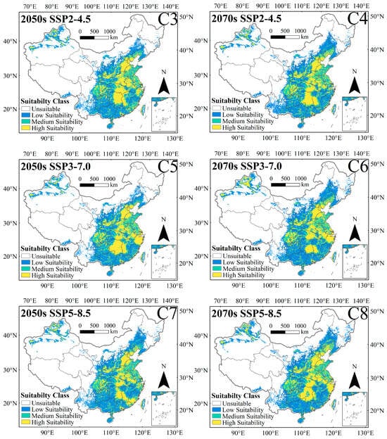 Potential habitat projections for C. punctiferalis under the SSP1-2.6 (C1,C2), SSP2-4.5 (C3,C4), SSP3-7.0 (C5,C6), and SSP5-8.5 (C7,C8) scenarios in the 2050s and 2070s in China.