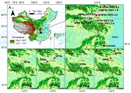 (A,B) Potential distribution center of C. punctiferalis under SSP1-2.6 (C), SSP2-4.5 (D), SSP3-7.0 (E), and SSP5-8.5 (F).