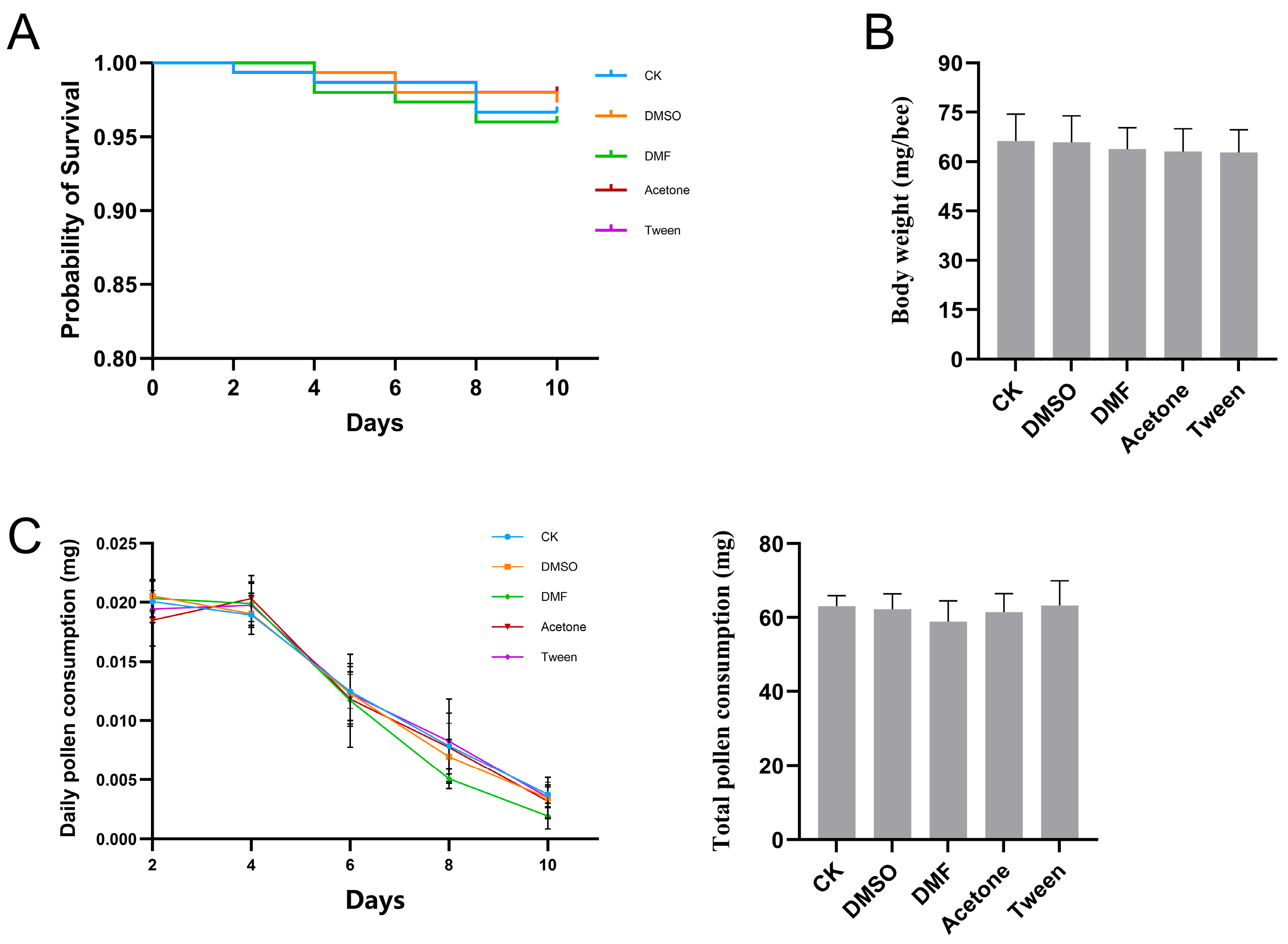 Figure 1. Effects of exposure to cosolvents on honeybee survival, body weight, and pollen consumption. (A) Kaplan–Meier survival curves over 10 days, showing no significant differences among control (CK) and treatment groups; n = 150. (B) Body weight measured post gut removal, showing no significant differences among groups; n = 50. (C) Daily and total pollen consumption per bee showed no significant differences among treatment groups; n = 150.