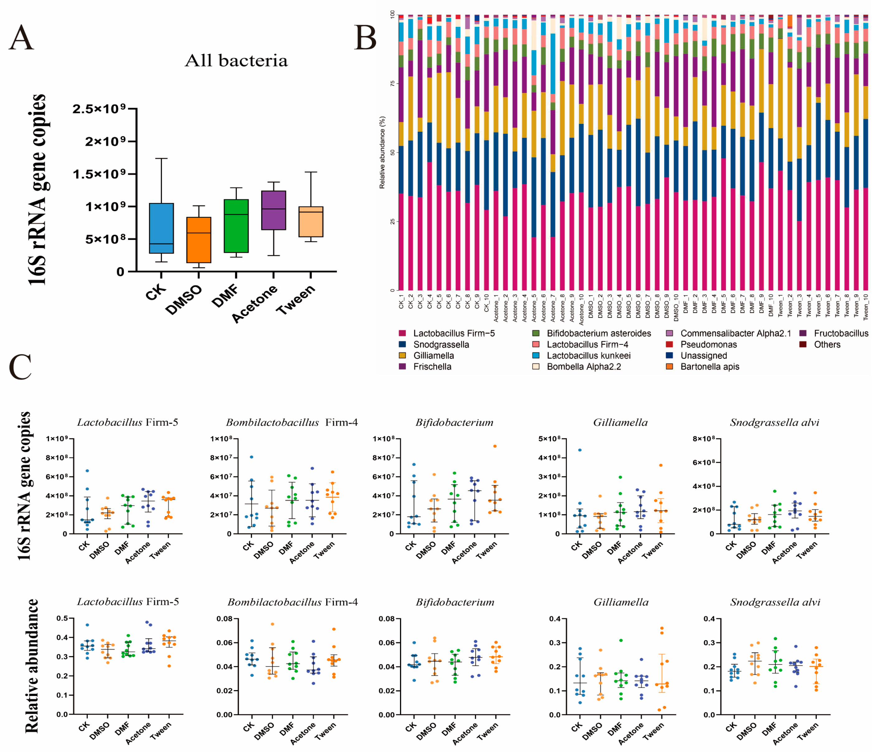 Newly emerged worker bees were simultaneously exposed to DMSO, DMF, acetone, and Tween 80. No evidence was found indicating that the four pesticide cosolvents disrupted the honeybee gut microbiome. There were no significant changes in gut bacterial load (Figure 2A, p = 0.423), community composition (Figure 2B), or the absolute and relative abundance of five core taxa (Figure 2C, p > 0.05).