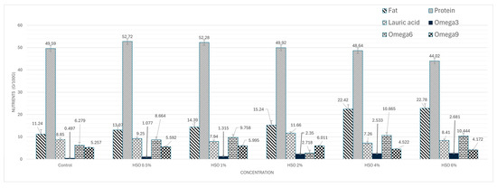 The fatty acid profile of dried BSFL was significantly affected by dietary treatments, particularly in the levels of omega-3, omega-6, and omega-9 fatty acids (Table 3). Lauric acid content, which was 8.85 g/100 g in the control group, varied between 7.26 and 11.66 g/100 g when the HSO inclusion level increased to 4–6%. The concentration of omega-3 increased markedly (p < 0.05) across treatments, rising from 0.497 g/100 g in the control group to a maximum of 2.681 g/100 g at the highest supplementation level. In contrast, Omega-6 levels exhibited a non-linear pattern. They increased from 6.279 g/100 g in the control to 8.664 g/100 g at 0.5% HSO and 9.758 g/100 g at 1% HSO but markedly decreased to 2.718 g/100 g at 2% HSO before rising again to 10.665 and 10.444 g/100 g at 4% and 6% HSO, respectively (p < 0.05). For Omega-9, concentrations increased slightly from 5.257 g/100 g in the control to 5.592 and 5.995 g/100 g at 0.5% and 1% HSO, reached a maximum of 6.011 g/100 g at 2% HSO, and then declined to 4.522 and 4.172 g/100 g at 4% and 6% HSO, respectively (p < 0.05). (Table 3, Figure 1).
