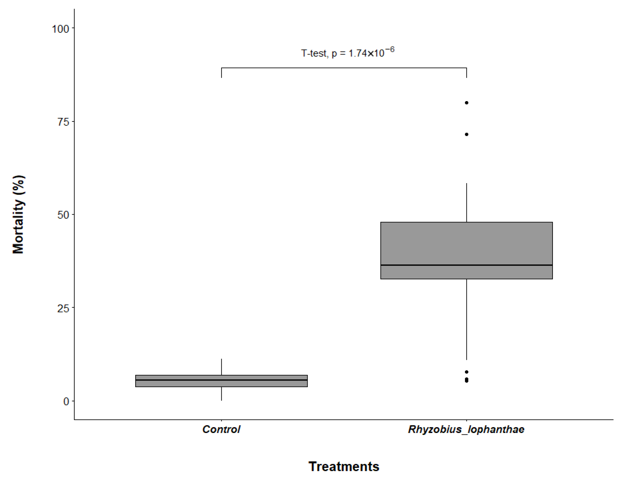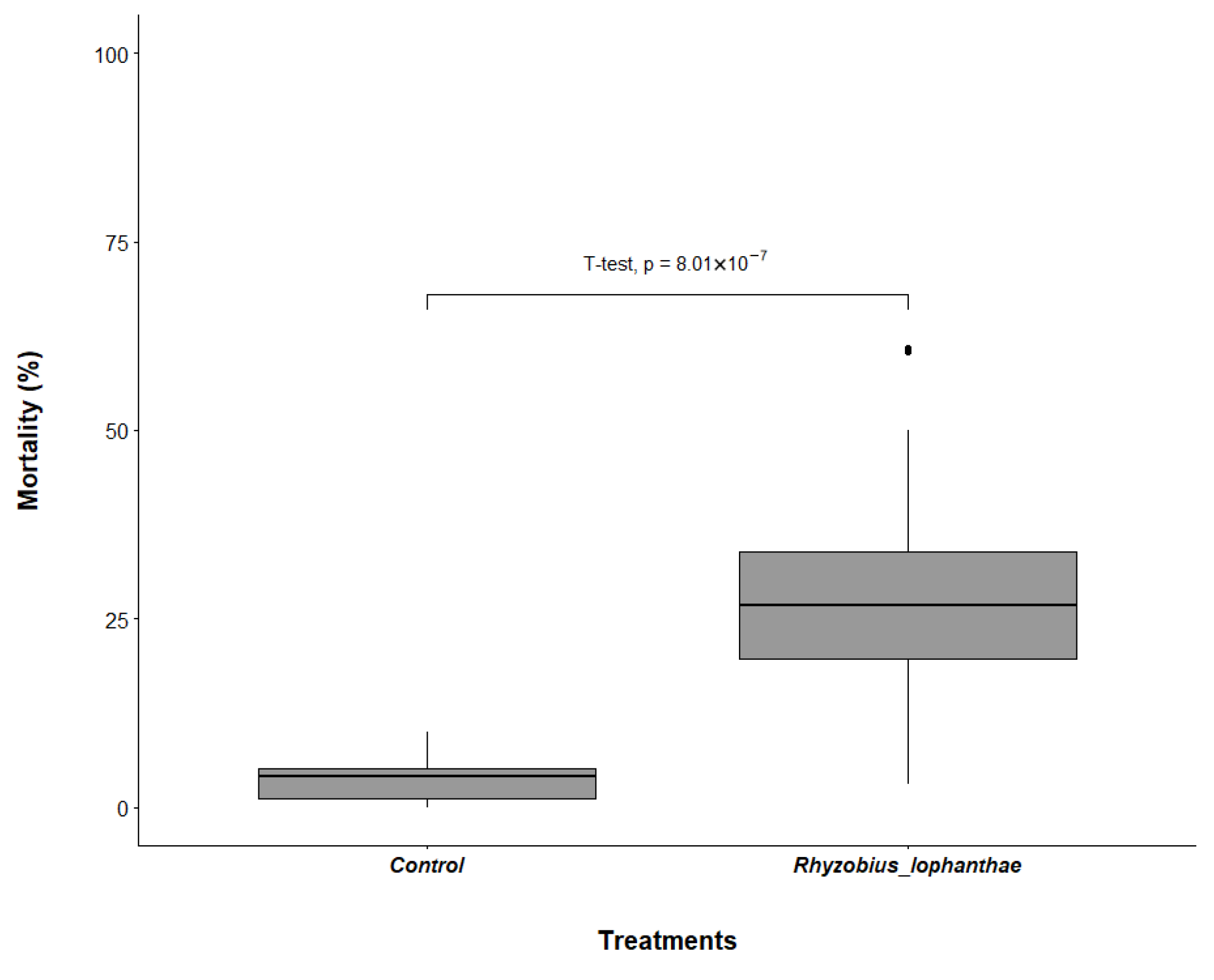 2.3. Mortality of D. citri Eggs and Nymphs Exposed to R. lophanthae