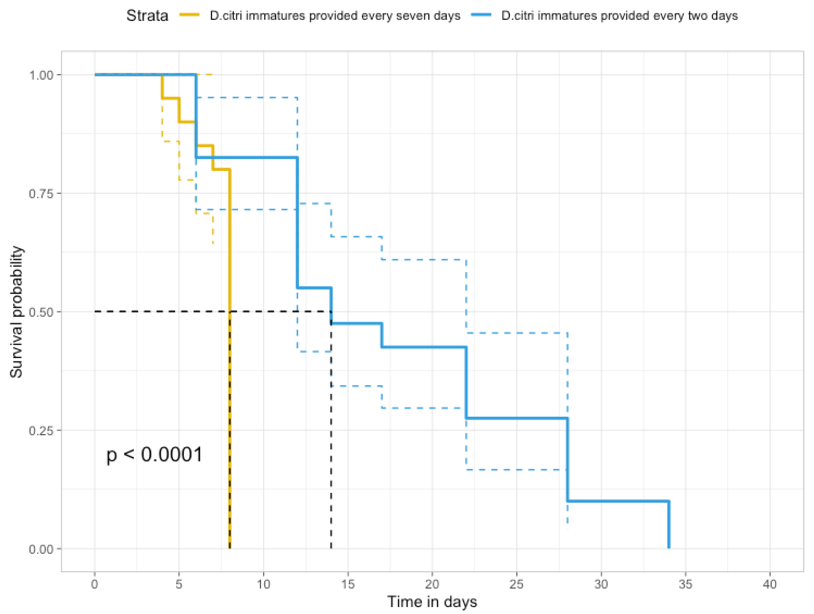 2.6. Field Evaluation of the R. lophanthae Adult Survival at Two Densities of D. citri Immatures