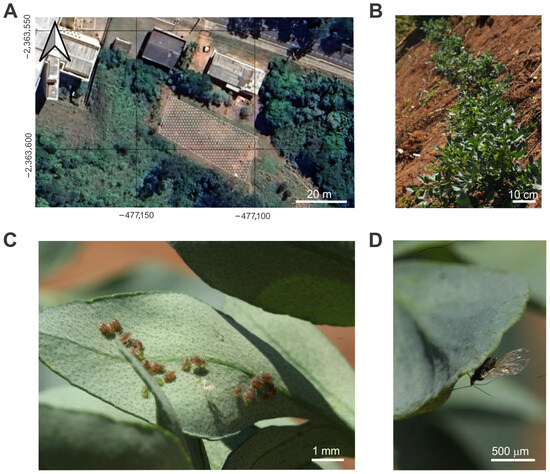 Study site in Viçosa, Minas Gerais State, Brazil. (A) Geospatial mapping of the R. chalepensis cultivation field. (B) R. chalepensis plants at the time of insect sampling. (C) Wingless Myzus persicae individuals feeding on the abaxial surface of R. chalepensis leaves. (D) Winged M. persicae initiating infestation on a previously uninfested R. chalepensis plant.