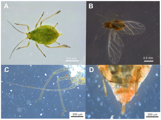 (A) Wingless Myzus persicae adult immediately after sampling from a R. chalepensis plant. (B) Winged M. persicae adult immediately after sampling from a R. chalepensis plant. (C) Microscopic image showing morphological details of the clarified aphid antennae. (D) Microscopic image showing morphological details of the clarified aphid caudal region.