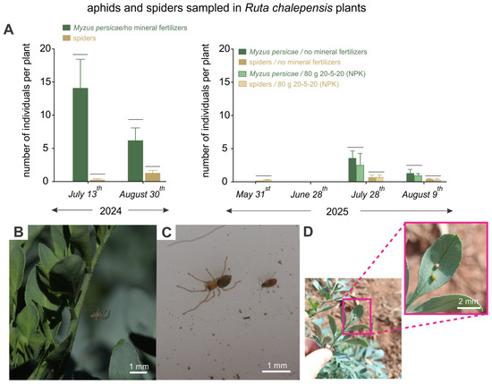 Aphid and predatory spider occurrence on R. chalepensis plants. (A) Average numbers of M. persicae and predatory spiders recorded on two sampling dates. (B) Predatory spider on its web on an R. chalepensis plant. (C) Predatory spider and aphid together inside a sampling tray. (D) Example of parasitized aphids recorded on the final sampling day of the 2025 season. (A,B) Bars aligned on the same horizontal line represent groups that are not significantly different, based on Tukey’s HSD test (p < 0.05).