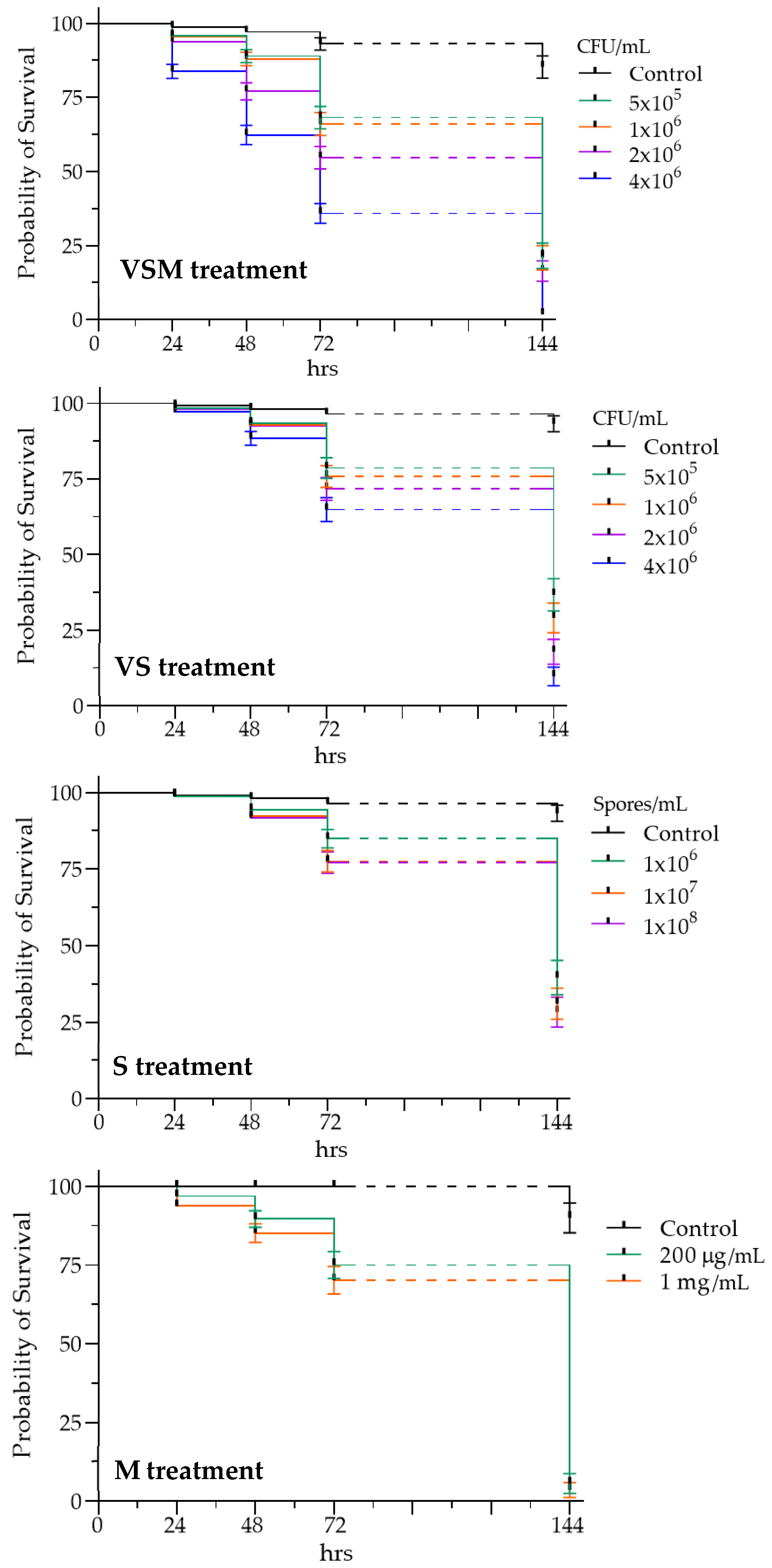 - Mastore, M.; Caramella, S.; Quadroni, S.; Brivio, M.F. Drosophila suzukii Susceptibility to the Oral Administration of Bacillus thuringiensis, Xenorhabdus nematophila and Its Secondary Metabolites. Insects 2021, 12, 635. [Google Scholar] [CrossRef]