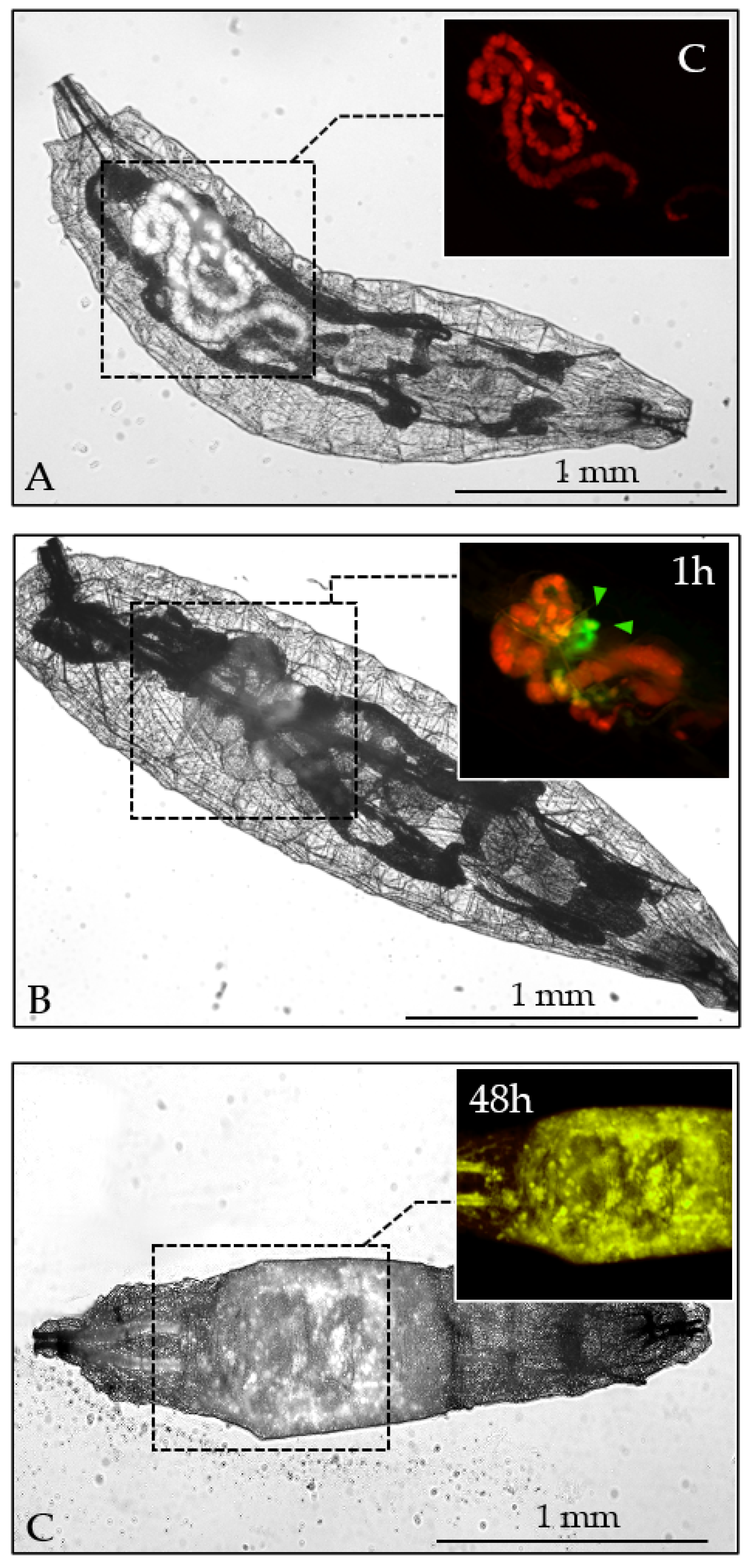 - Guo, W.; Kain, W.; Wang, P. Effects of Disruption of the Peritrophic Membrane on Larval Susceptibility to Bt Toxin Cry1Ac in Cabbage Loopers. J. Insect Physiol. 2019, 117, 103897. [Google Scholar] [CrossRef]