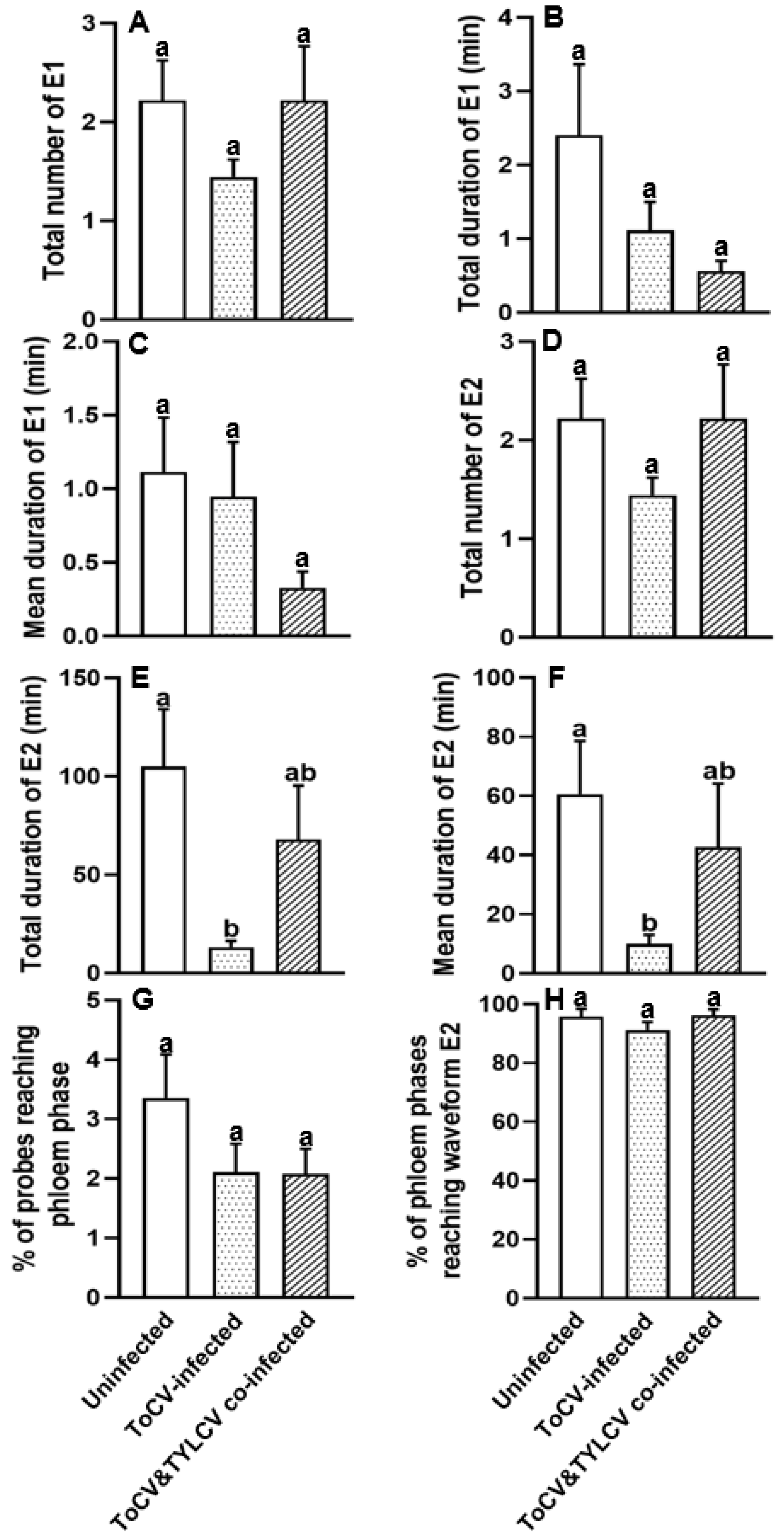 3.2. Feeding Behavior at Phloem Phase of Bemisia tabaci on ToCV-Infected, ToCV&TYLCV Co-Infected, and Un-Infected Tomato Plants