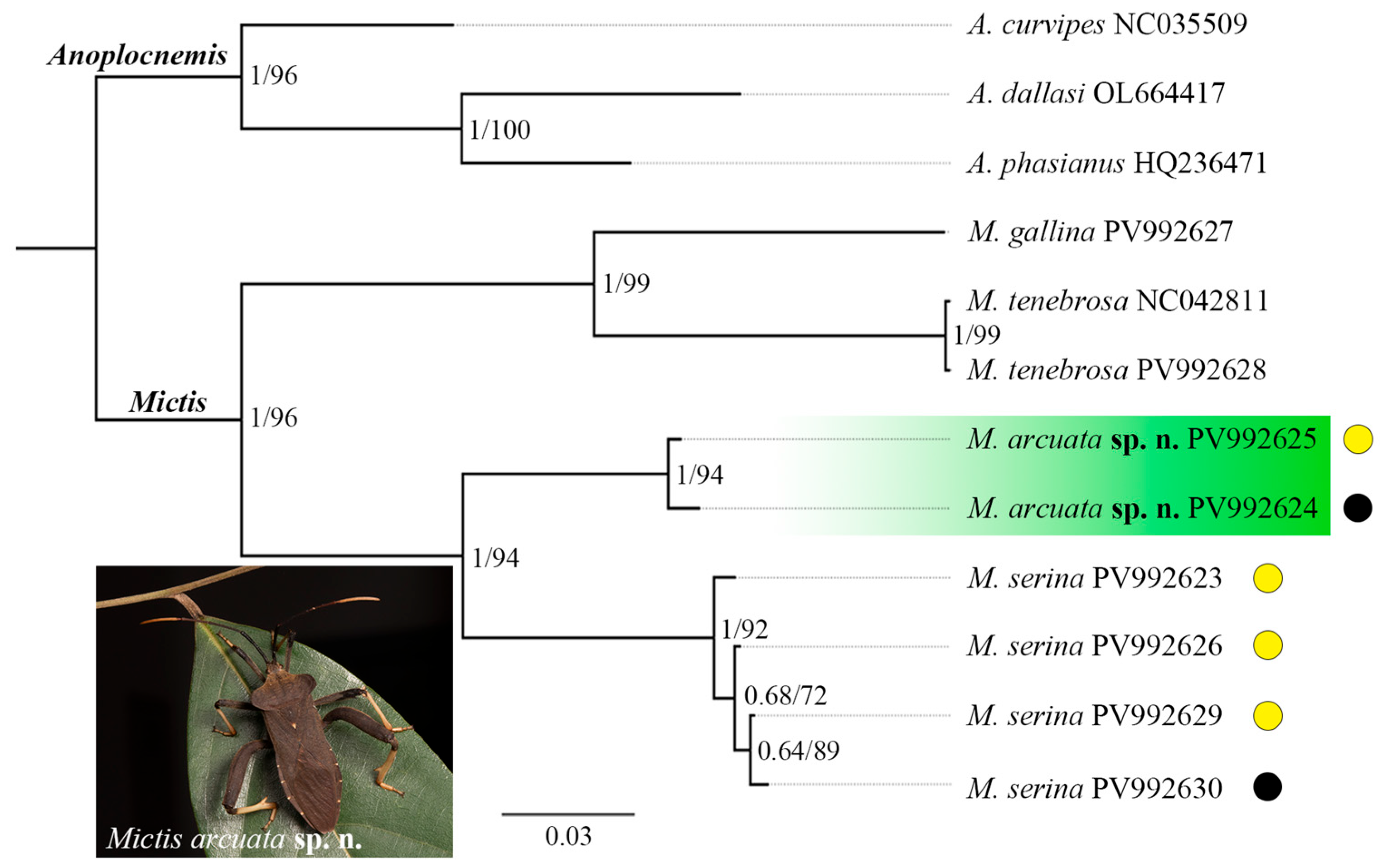Diagnosis. Mictis arcuata sp. n. can be diagnosed from all other species by the following morphological characters: (1) body size large (28.2–31.7 mm); (2) dark-brown, integument with irregular, short, reddish-brown serration; (3) pronotum extremely extended laterally beyond lateral margins of corium base; (4) anterolateral borders arcuate, smooth, without serration; (5) humeral angles obtuse; (6) tibiae pale orange with dark-brown base to entirely dark-brown; (7) male hind tibia with a large spine at posterior half; (8) male with entire abdominal segments IV produced into a tubercle; (9) male posterior margin of segment IV slightly produced, overlapping anterior margin of segment V.