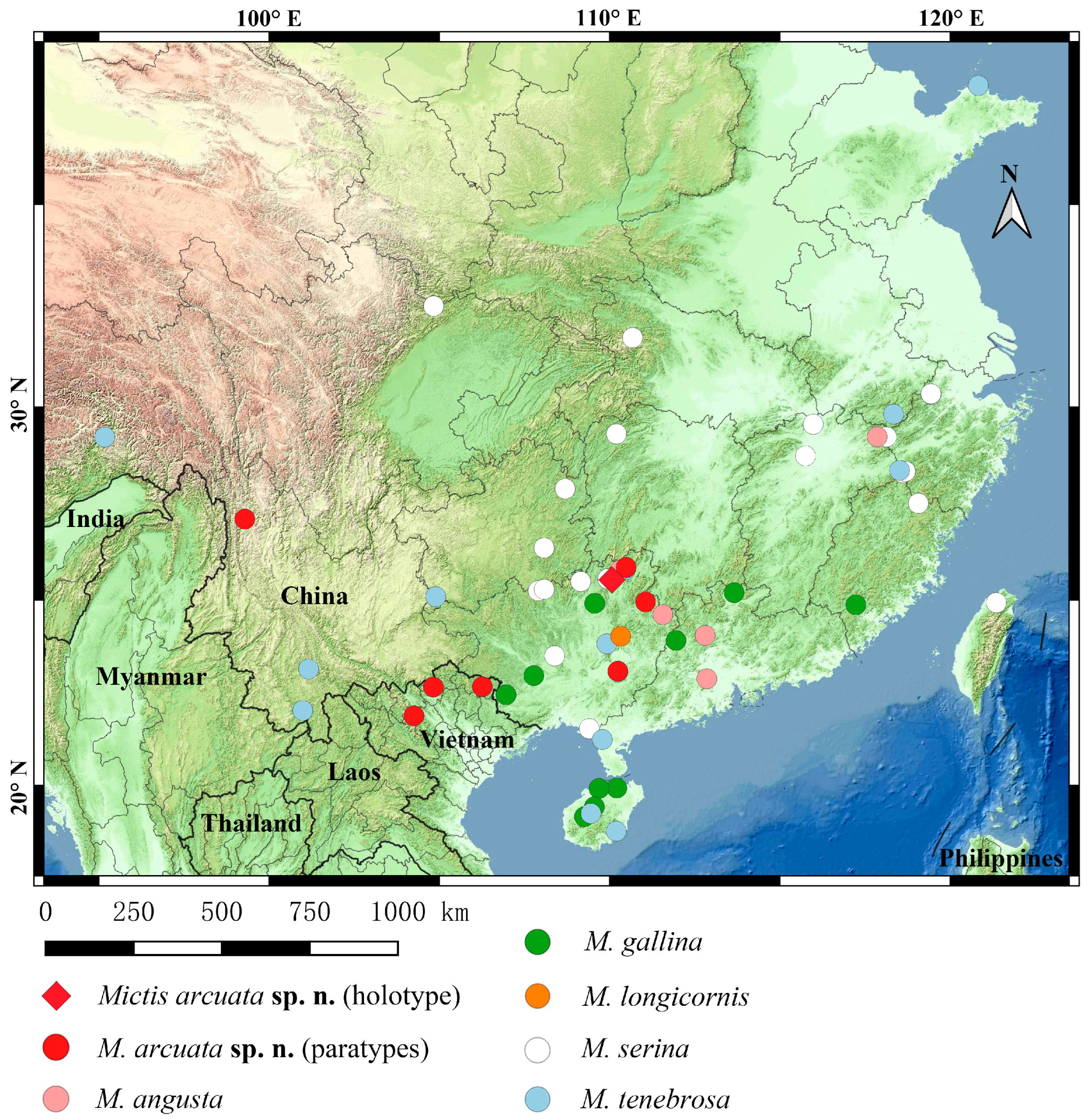 Type material. Holotype. ♂, China, Guangxi Zhuang Autonomous Region, Guilin City, Lingui District, Wantian Yao Ethnic Township, 25.5347° N, 110.0706° E, alt. 220 m, 9-IX-2024, Haofei Fan leg. (IZCAS). Paratypes. 1♀, China, Guangxi Zhuang Autonomous Region, Guilin City, Xing’an County, Gaozhai Village, 25.8555° N, 110.4852° E, alt. 492 m, 13-VII-2011, Hanyong Liu leg. (SHEM); 1♂, China, Guangxi Zhuang Autonomous Region, Guiping City, Junfeng Village, 23.0931° N, 110.2453° E, alt. 133 m, VII-2024, De Huang leg. (CHX); 1♂, China, Hunan Province, Yongzhou City, Jiangyong County, Yangjia, 24.9408° N, 111.0570° E, alt. 488 m, 27-IX-2025, Jianping Rong leg. (CHX); 1♂, China, Yunnan Province, Weixi Lisu Autonomous County, Xuelong Mountain, 27.1647° N, 99.3234° E, alt. 2 220 m, X-2023, Guirong Zhang leg. (CHX); 1♂1♀, Vietnam, Cao Bang Province, Cao Bang City, 22.6754° N, 106.2753° E, alt. 208 m, IV-2024, local villagers leg. (SHEM); 1♂, Vietnam, Ha Giang Province, Vi Xuyen district, 22.6631° N, 104.8275° E, alt. 586 m, VII-2025, local villagers leg. (CHX); 1♂1♀, Vietnam, Yen Bai Province, Muong Khuong District, Nam Co Commune, 21.8380° N, 104.2969° E, alt. 943 m, IV-2023, local villagers leg. (CMO, IZCAS).