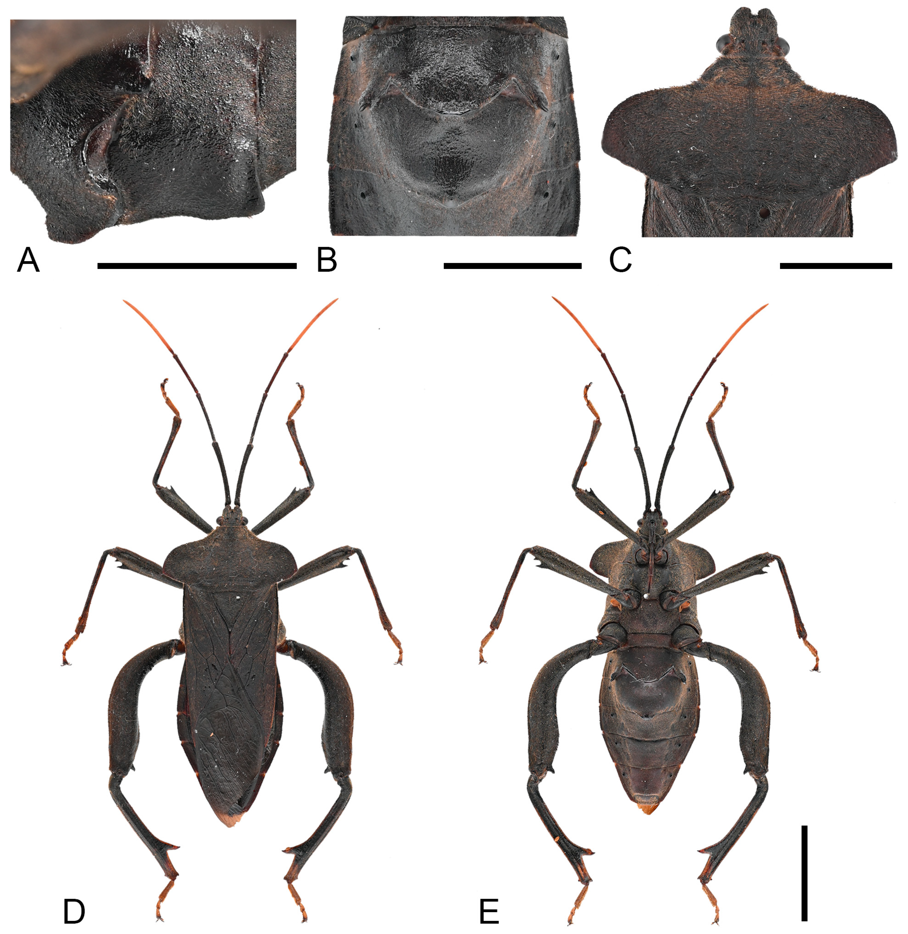 Diagnosis. Body large, stout; head quadrate, preocular pits well developed, antennifers large, prominent, positioned in close proximity, projecting anteriorly beyond the tylus, antennae long, terete; pronotum moderately declivous, pronotum shape variable, posterior margin smooth; scutellum exhibiting faint transverse striations; labium reaching or nearly reaching middle coxae; all femora armed with distal spines, hind femora incrassate in male, dorsal margin smooth or slightly tubercles, ventral margin distinctly tubercles; hind tibiae usually dilated ventrally in male, often bearing a large tooth; common boundary of abdominal segments III and IV forming a usually prominent median tubercle; abdominal segment III with a pair of small to large of ventrolateral tubercles; female seventh sternite featuring an elevated plica forming a blunt angulation; paramere robust, terminating in a short curved apex.