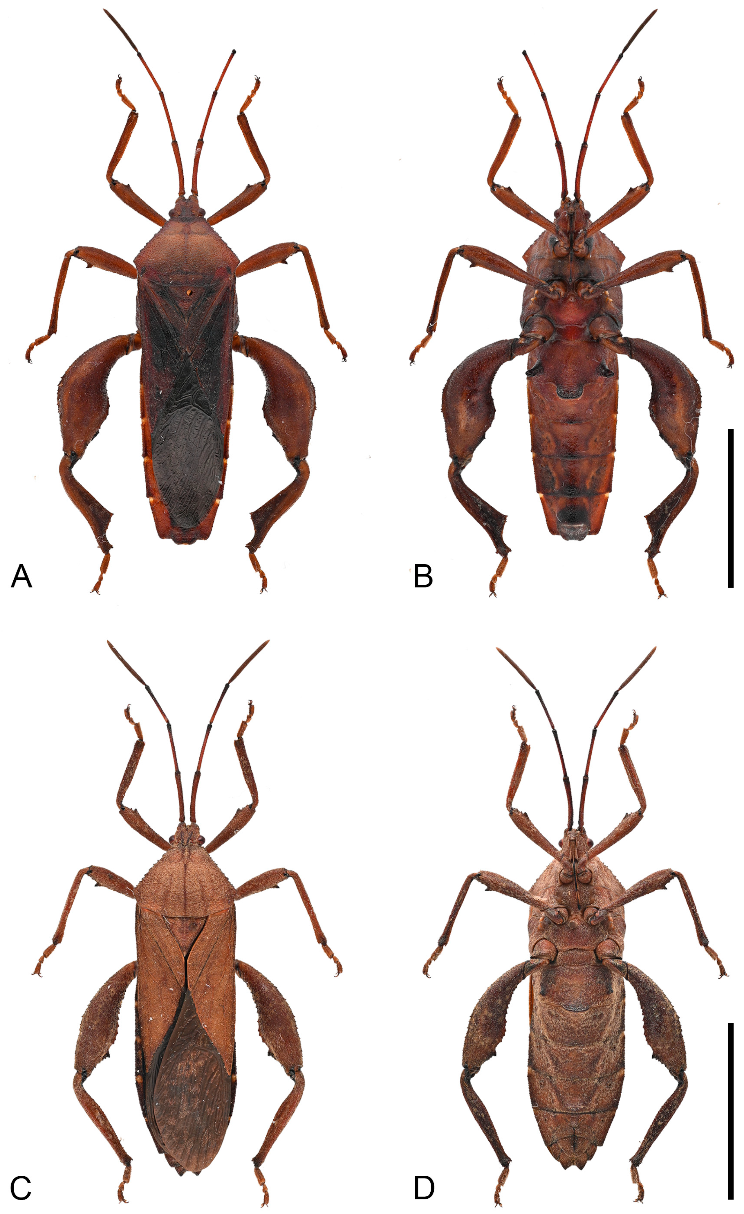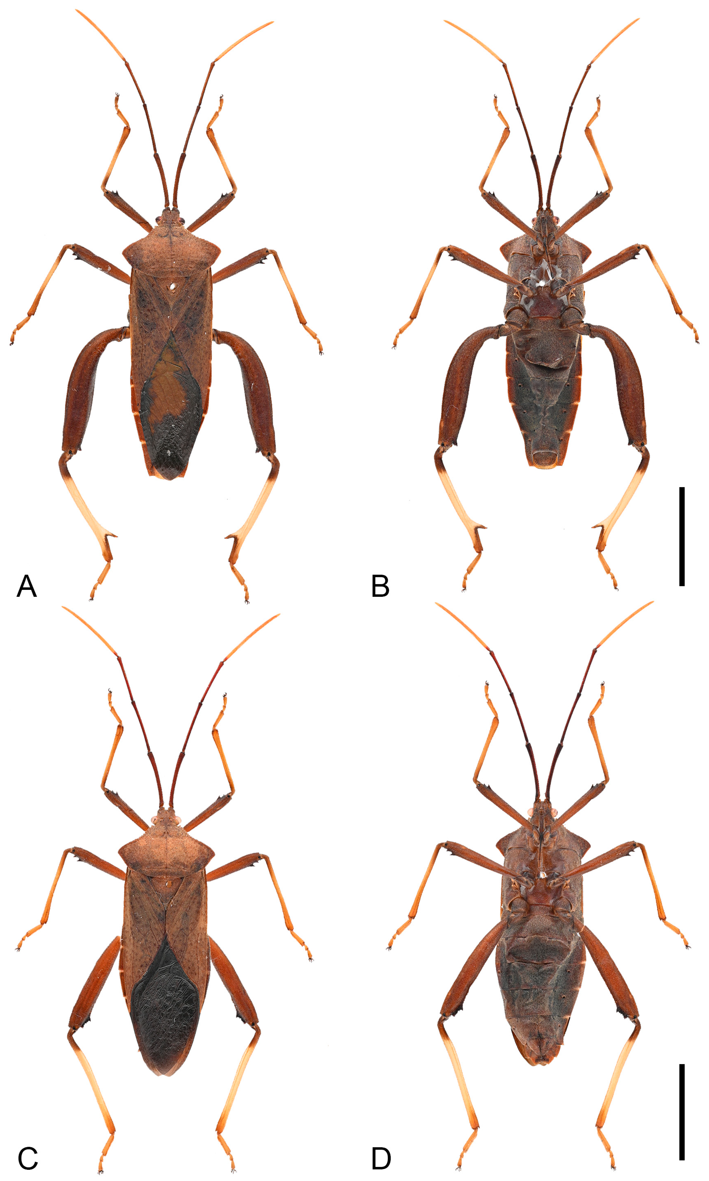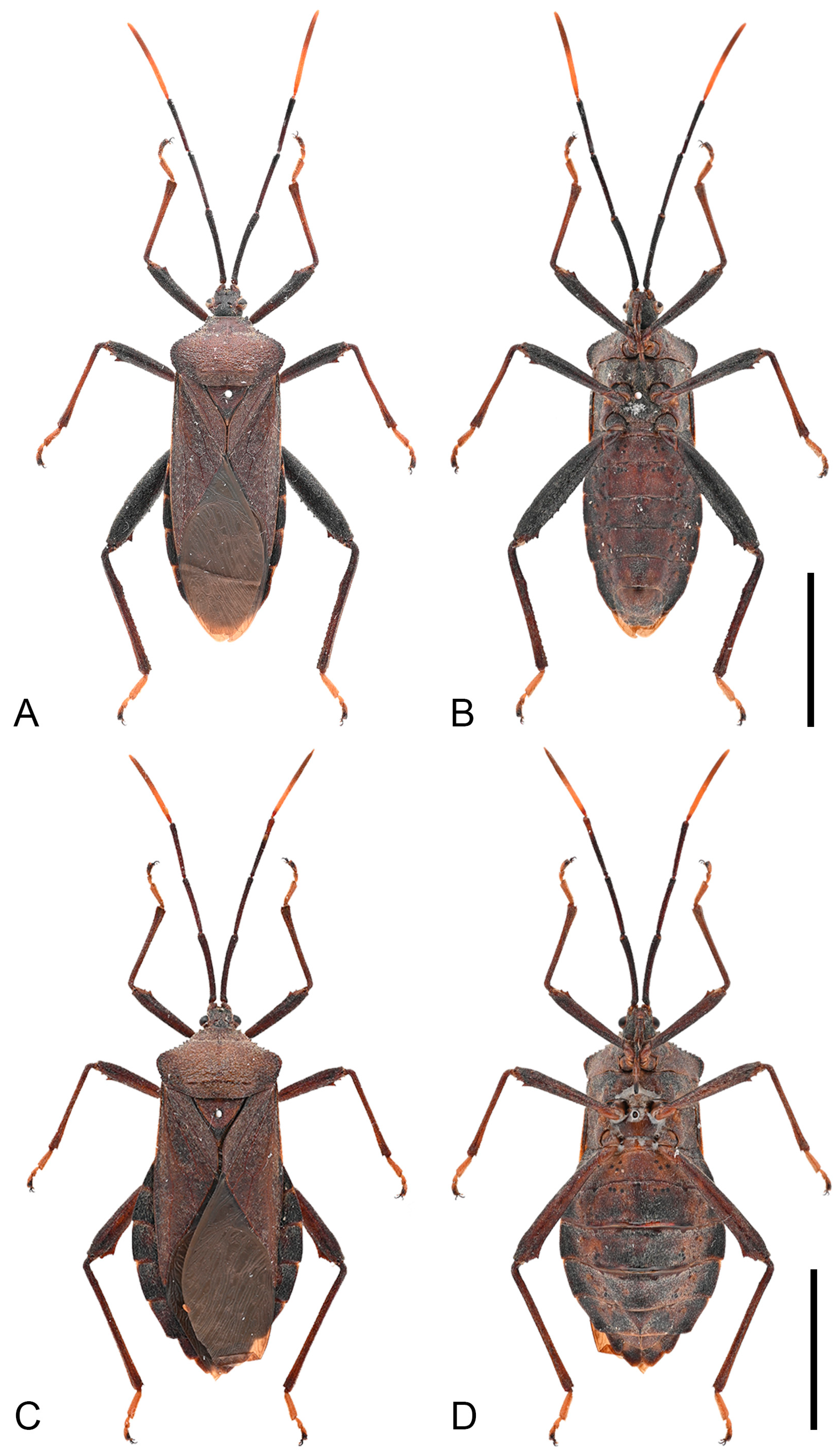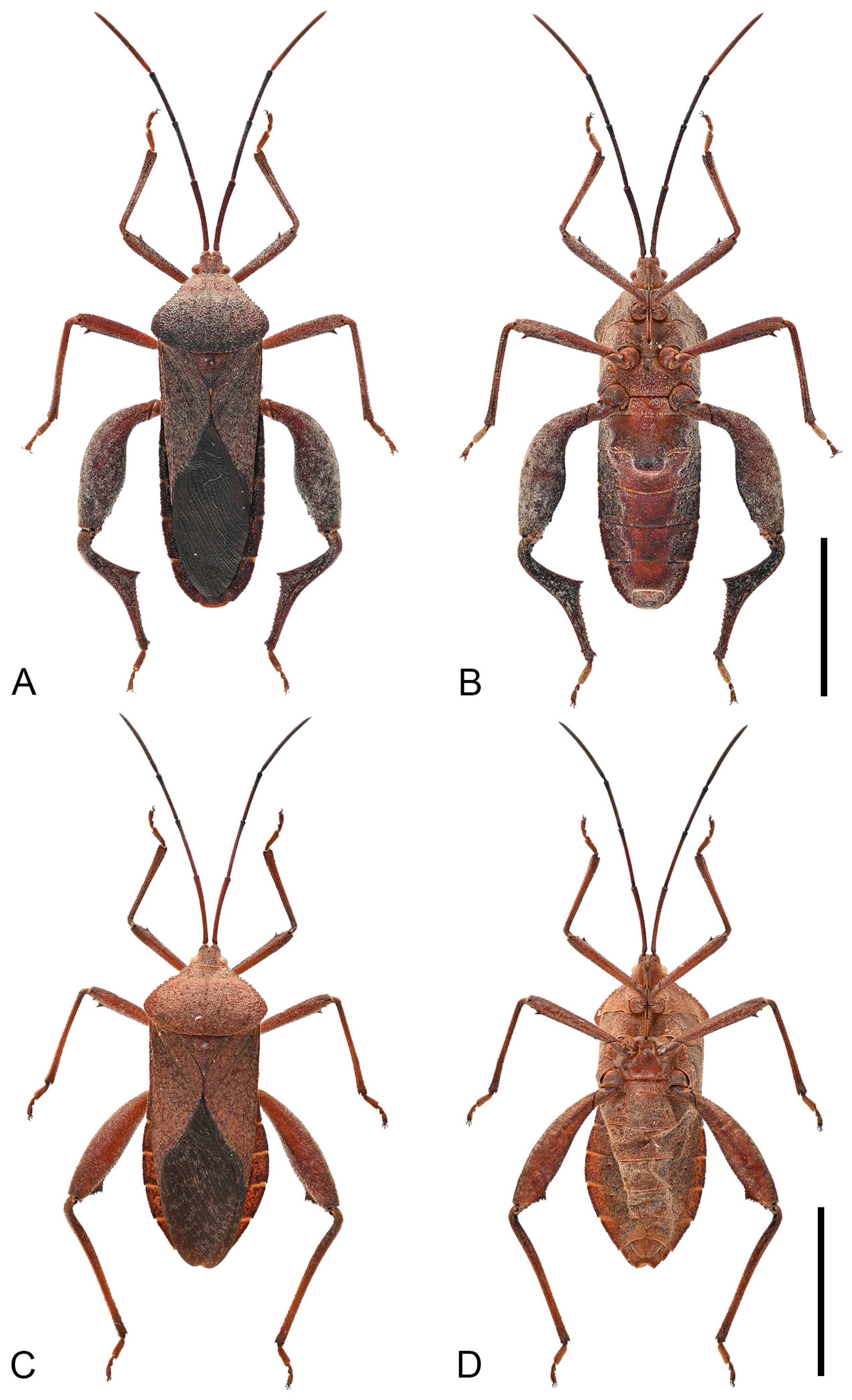 Habitus of Mictis tenebrosa. (A,B), male (Jinghong, Yunnan, China); (C,D), female, (Suixi, Guangdong, China); (A,C), dorsal; (B,D), ventral. Scales in 10 mm.
