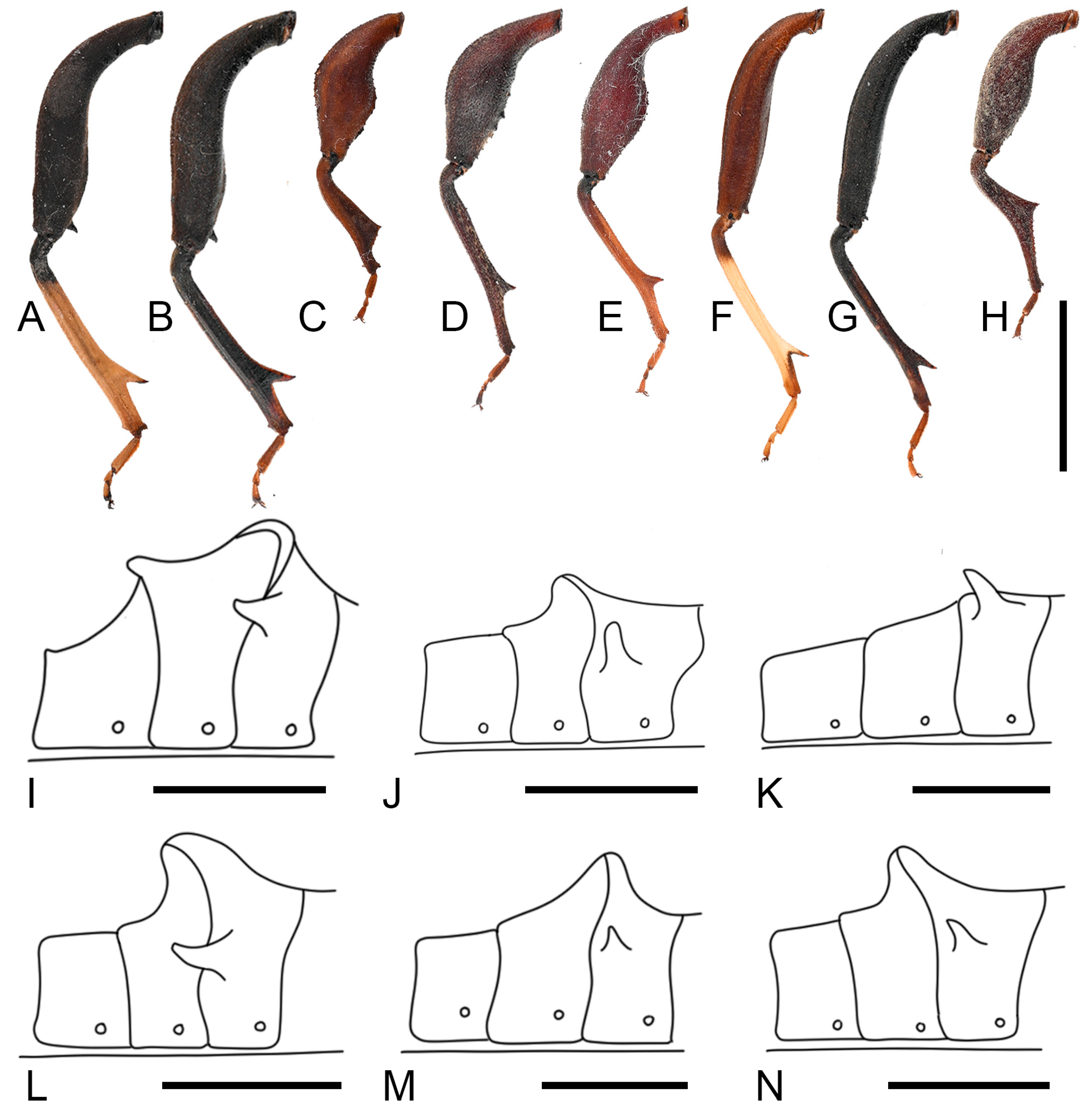 28]. However, after examining a large number of specimens, we found that tibial color exhibits continuous variation. Individuals with different tibial coloration can be collected from the same locality, and apart from tibial color, all other morphological features are identical (