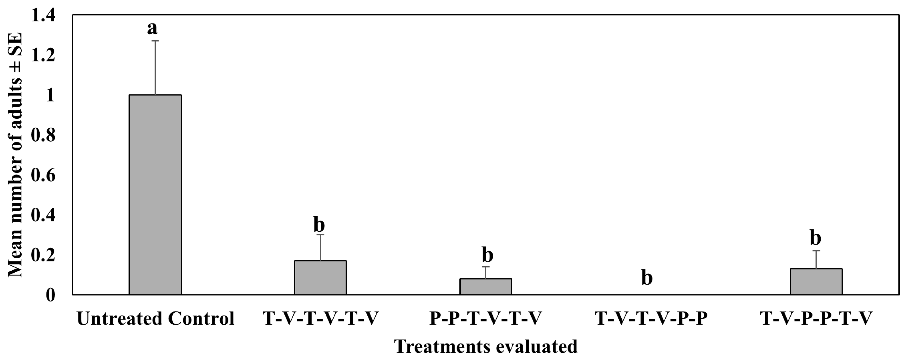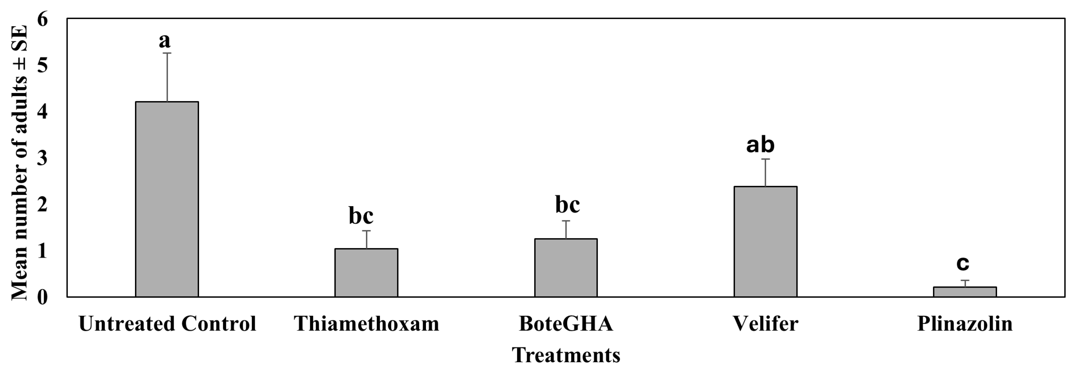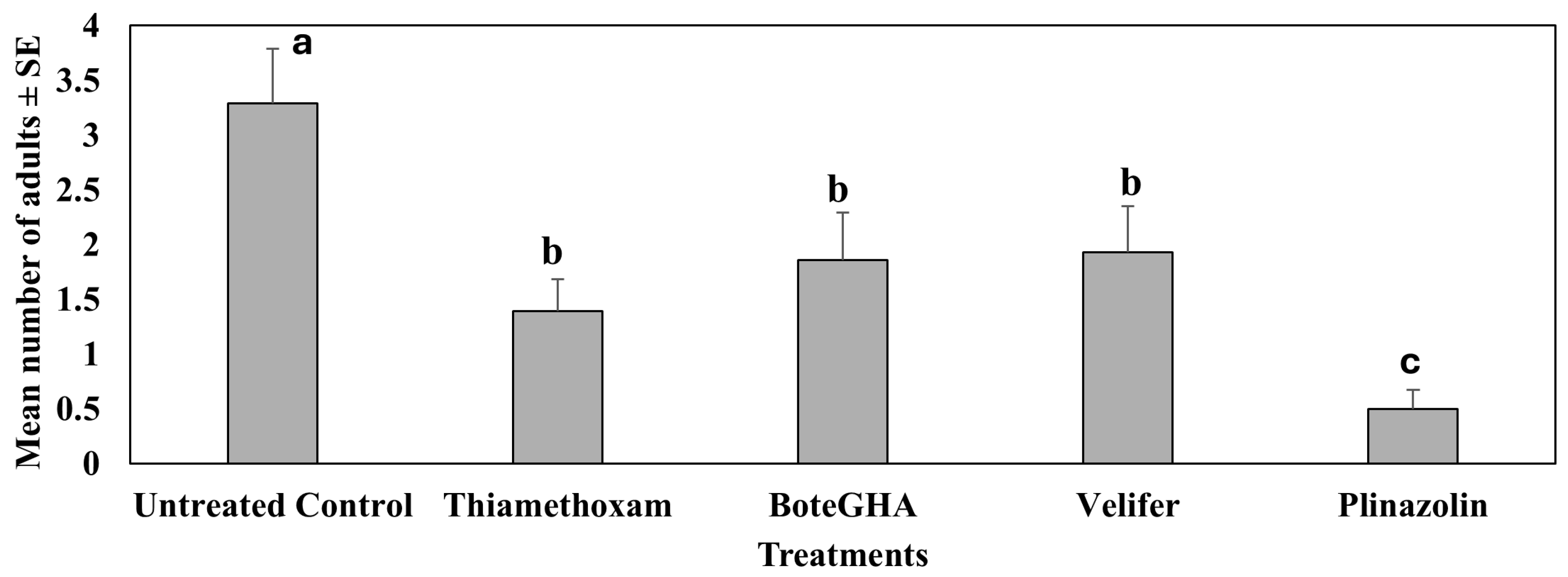 | Flupyradifurone | 14.0 | 0 a | 0.00 b | 0.00 b | 0.10 ab | 0.10 a | 0.35 a |