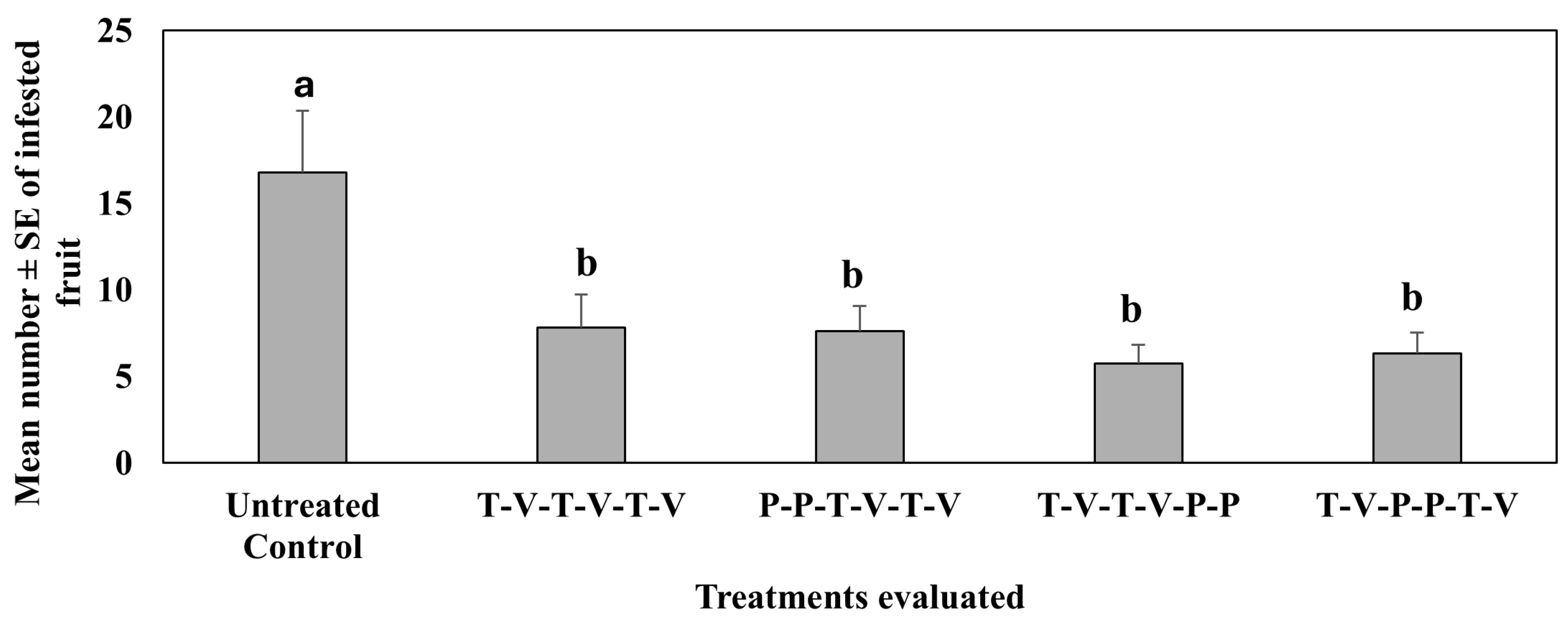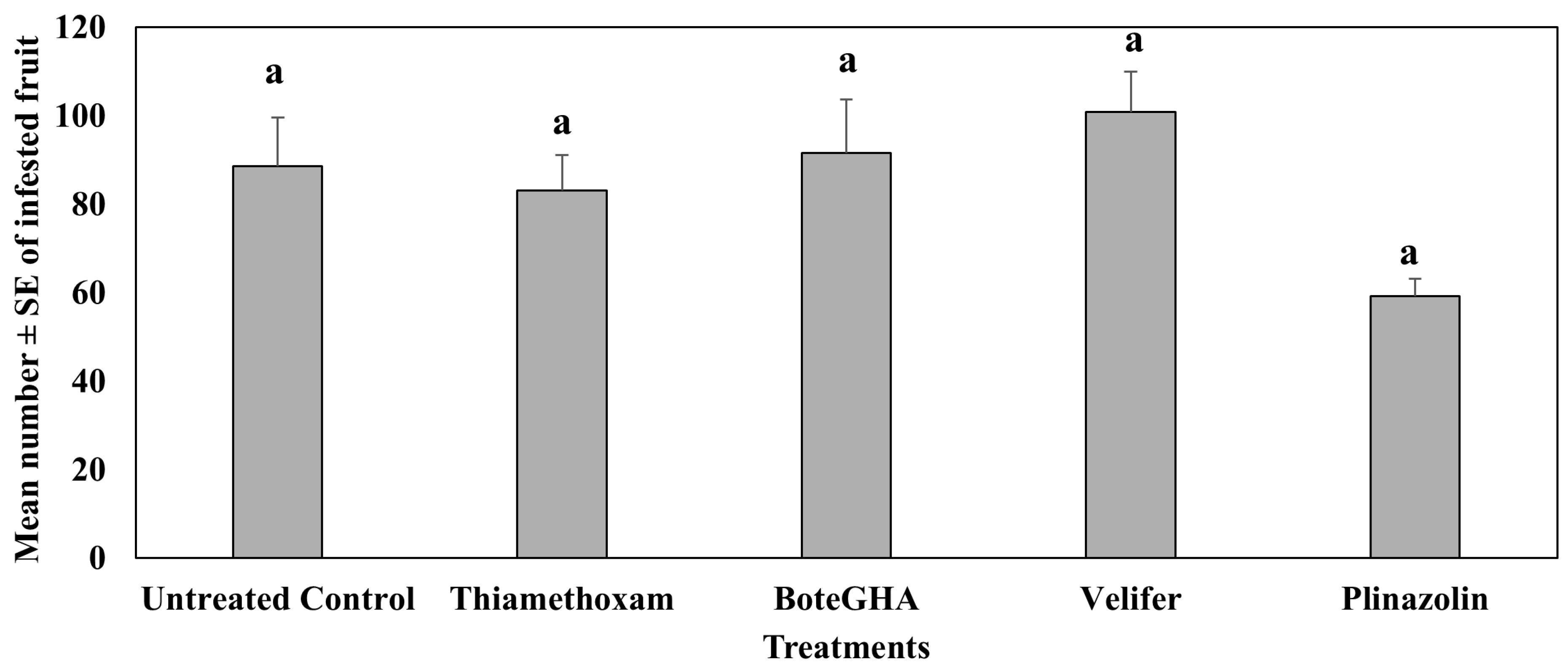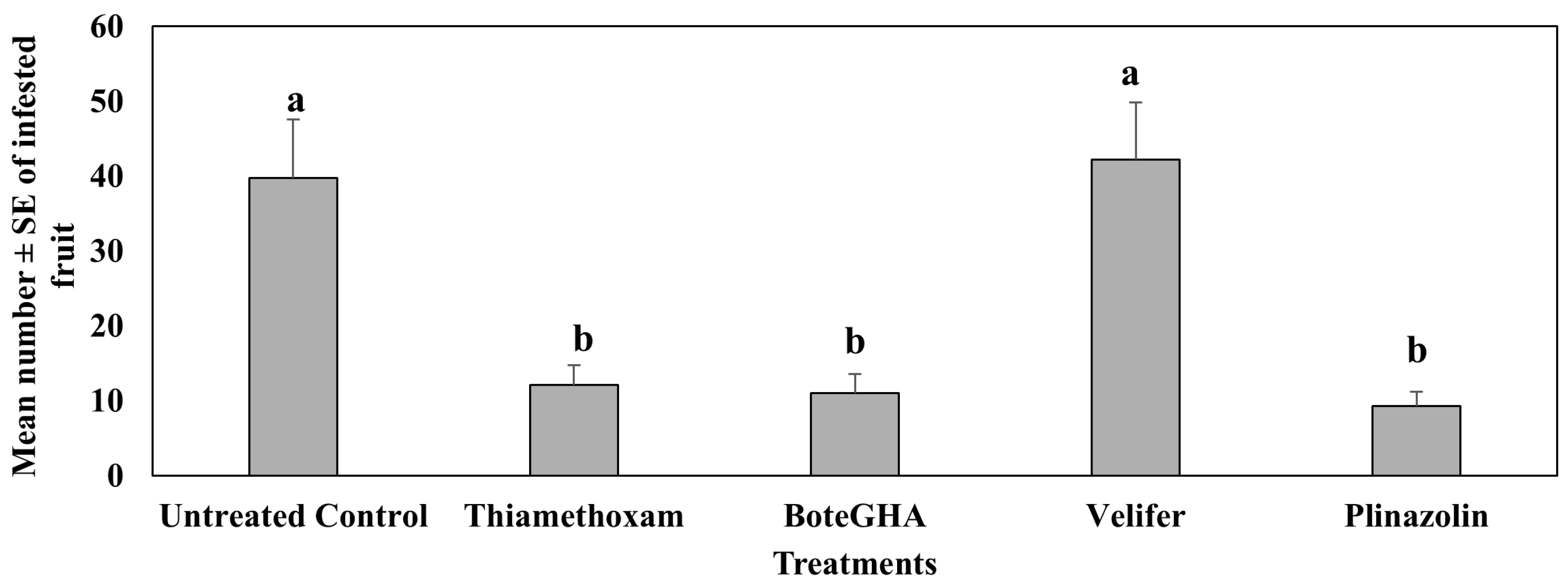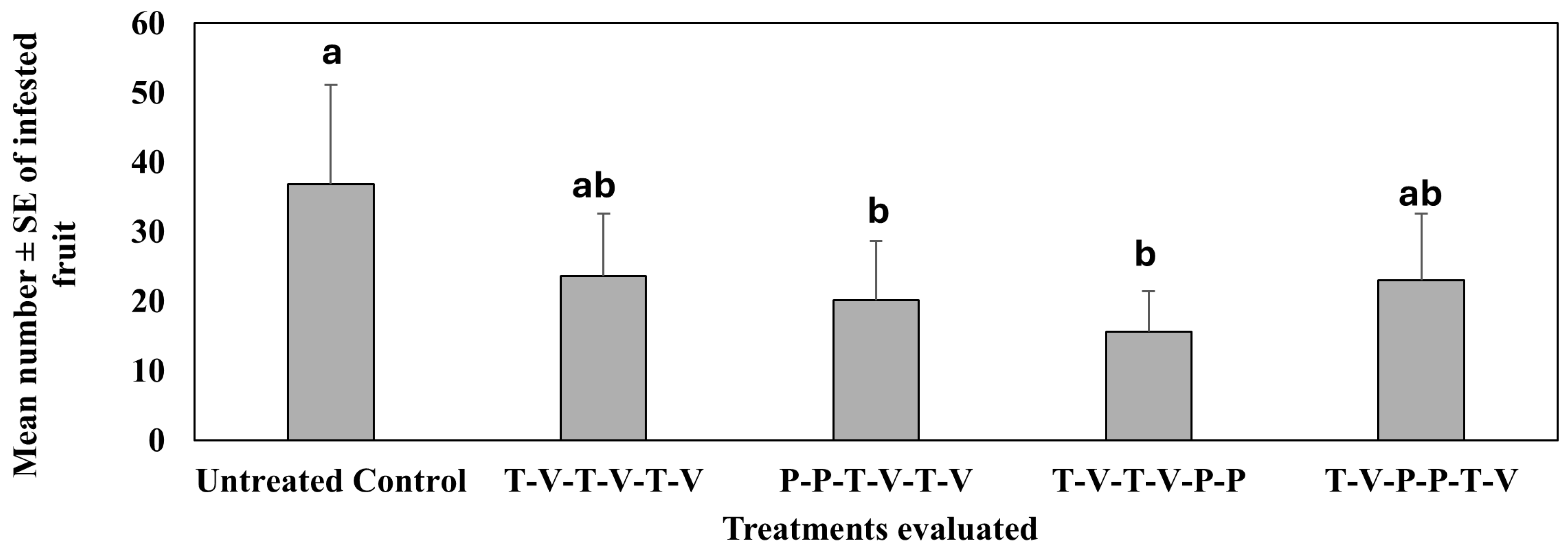 4.2. Treatment Effect on Pepper Weevil-Infested Fruit