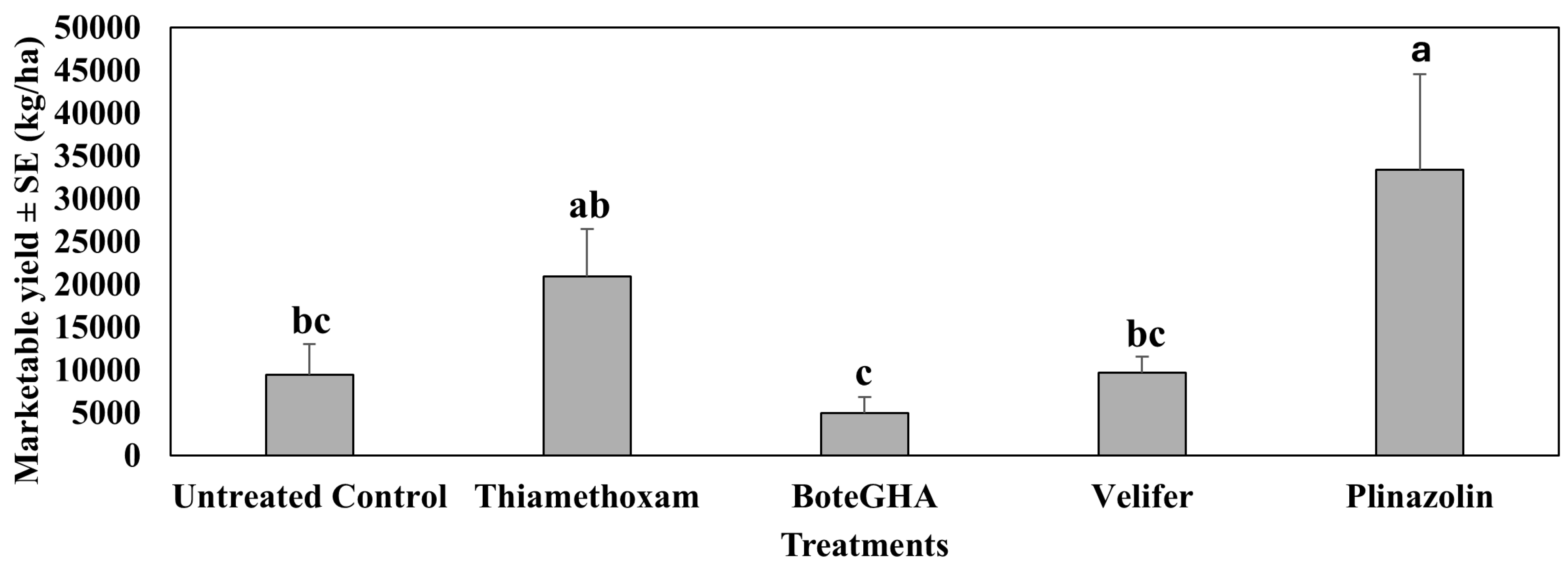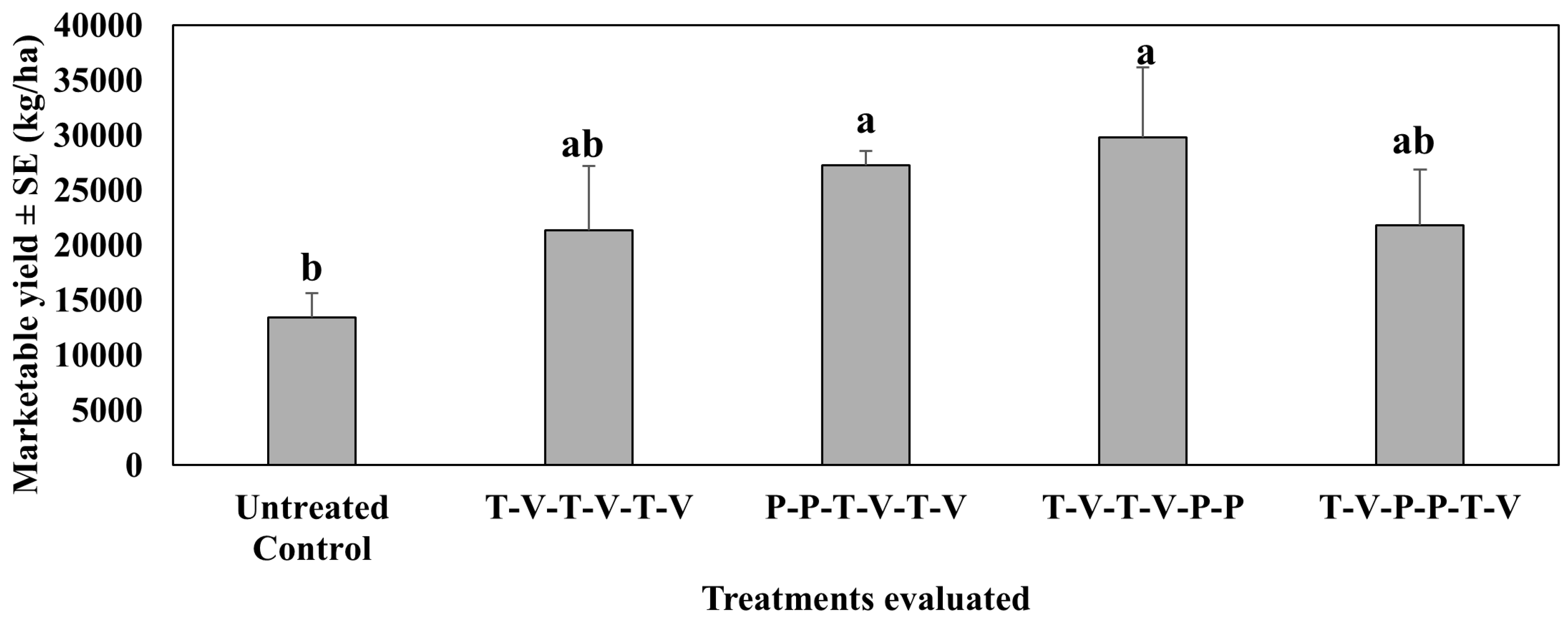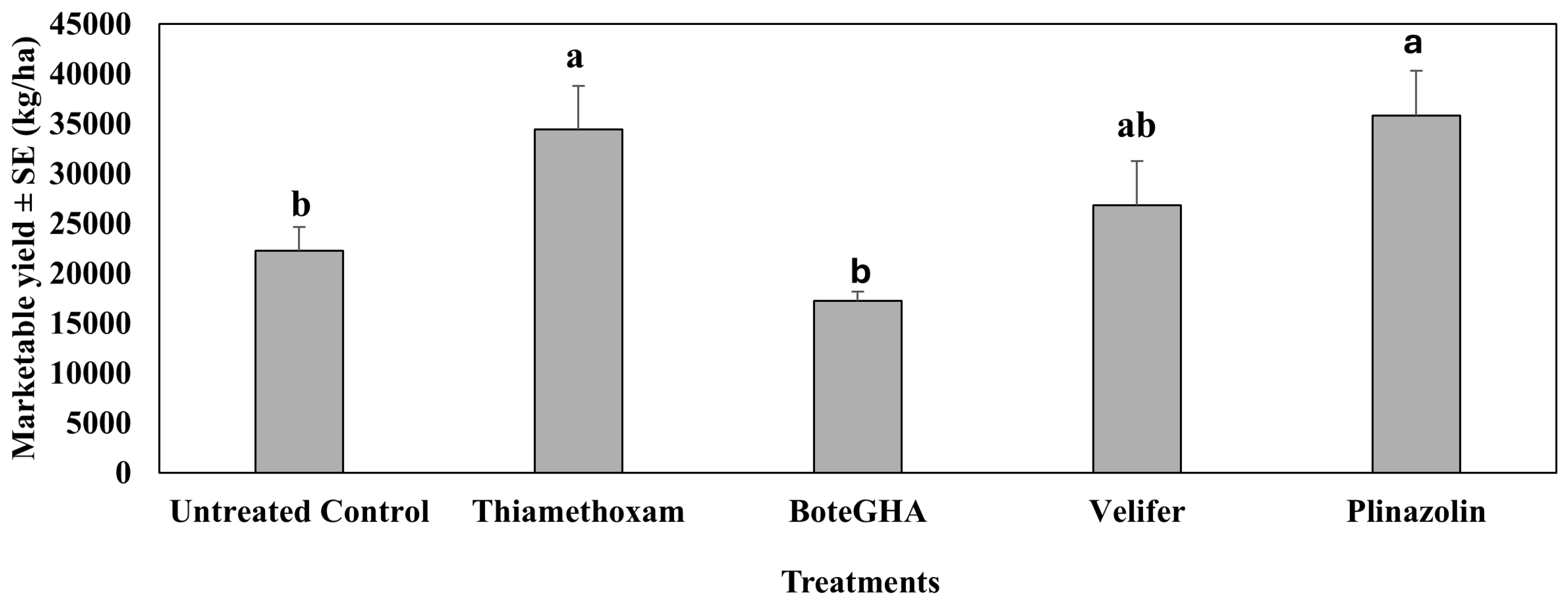 4.1. Treatment Effect on Pepper Weevil Adults on Foliage